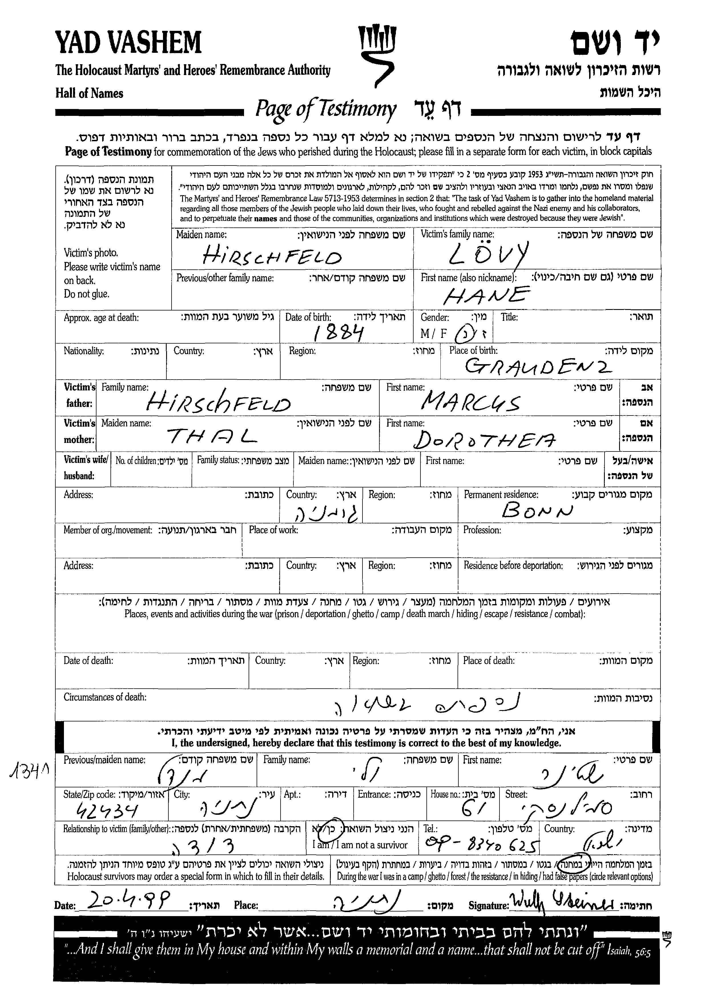 Hane Lovy לבית Hirschfeld נולדה בGraudenz שבפולין בשנת 1884 לMarcus וDorothea. לפני מלחמת העולם השניה התגוררה בBonn שבגרמניה.