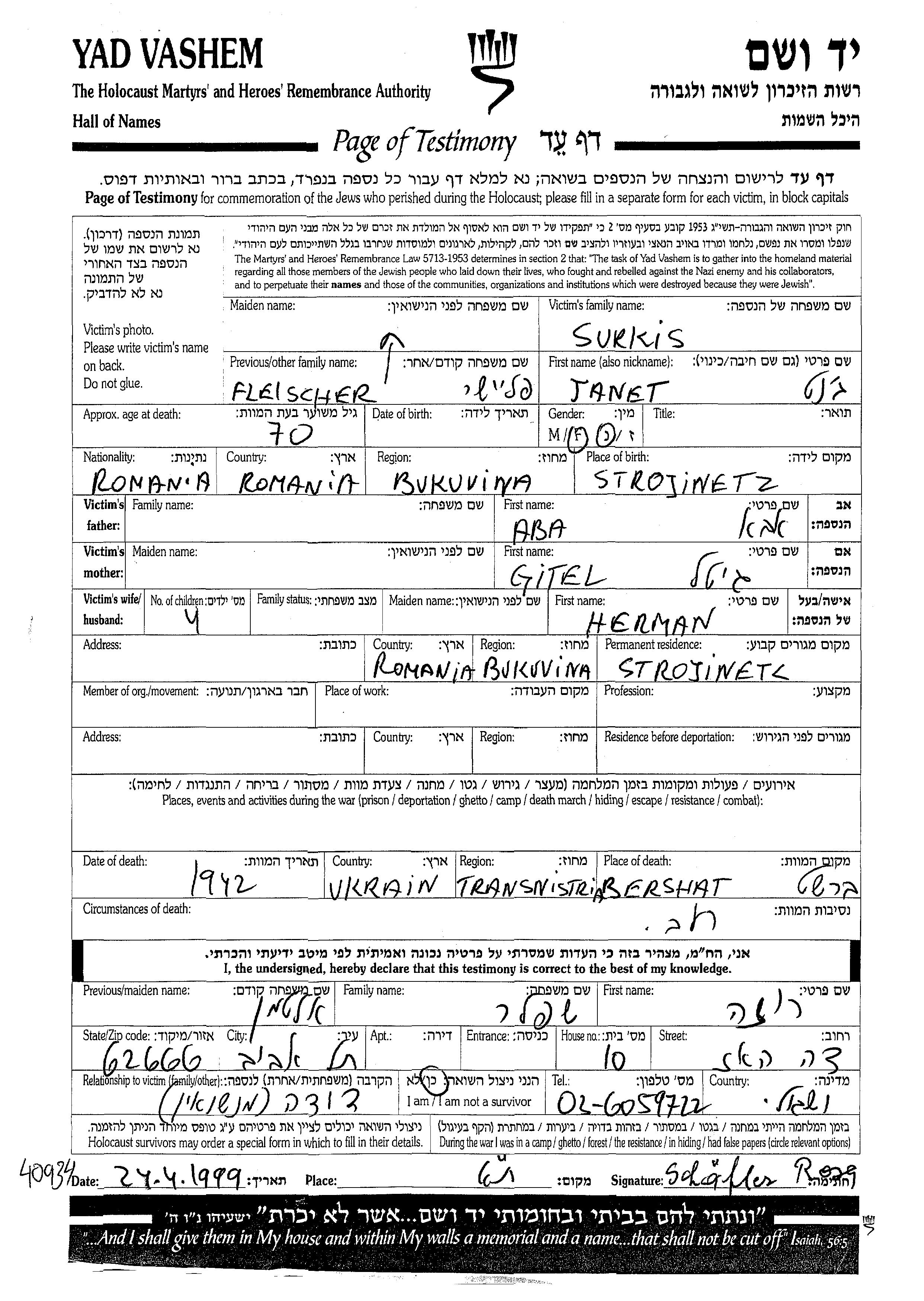 Janet סורקיס לבית Fleischer נולדה בStrojinetz שברומניה לאבא וגיטל. היא היתה נשואה להרמן. לפני מלחמת העולם השניה התגוררה בStrojinetz שברומניה.