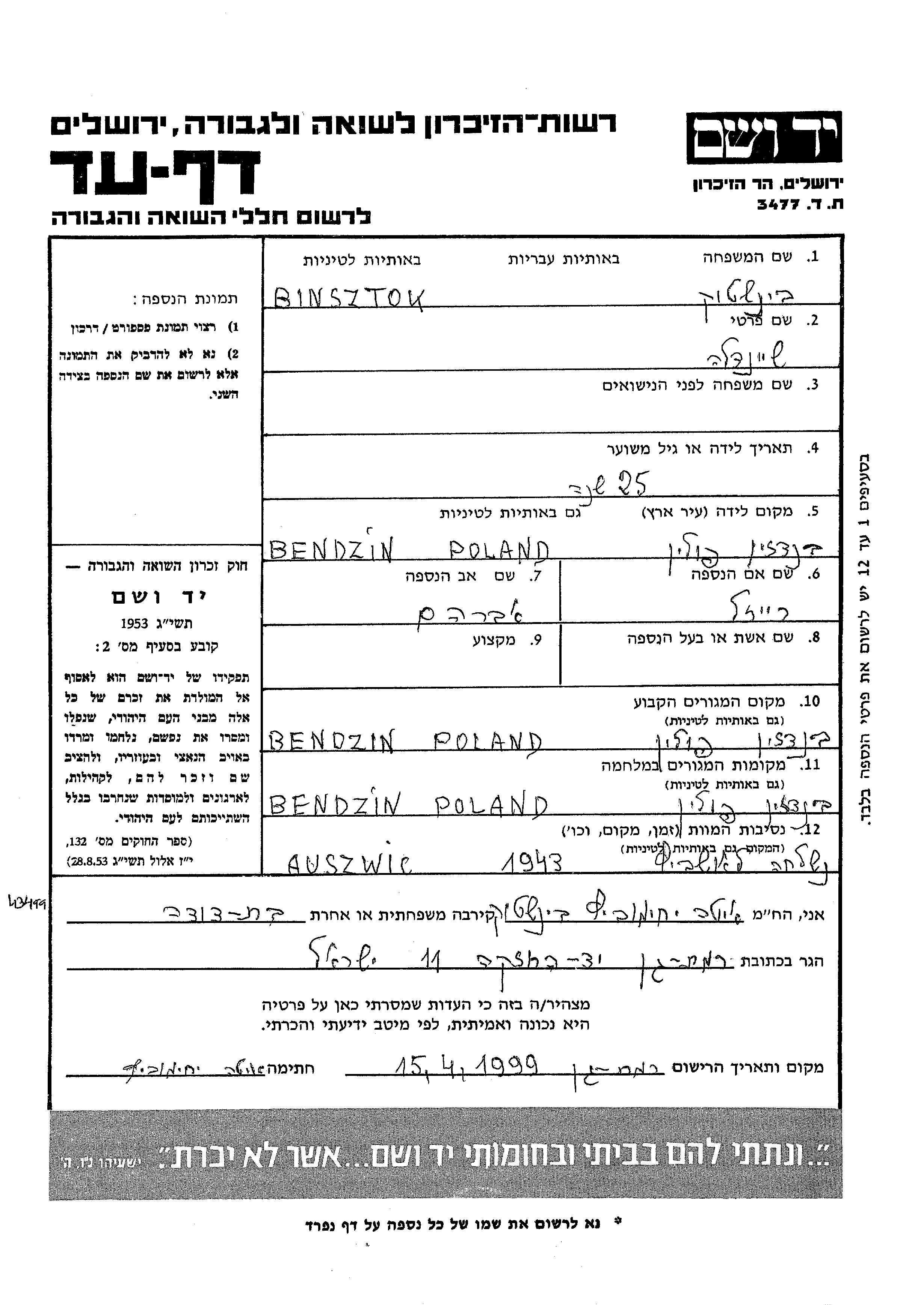 Binsztok שיינדלה Bendzin, פולין דף-עד