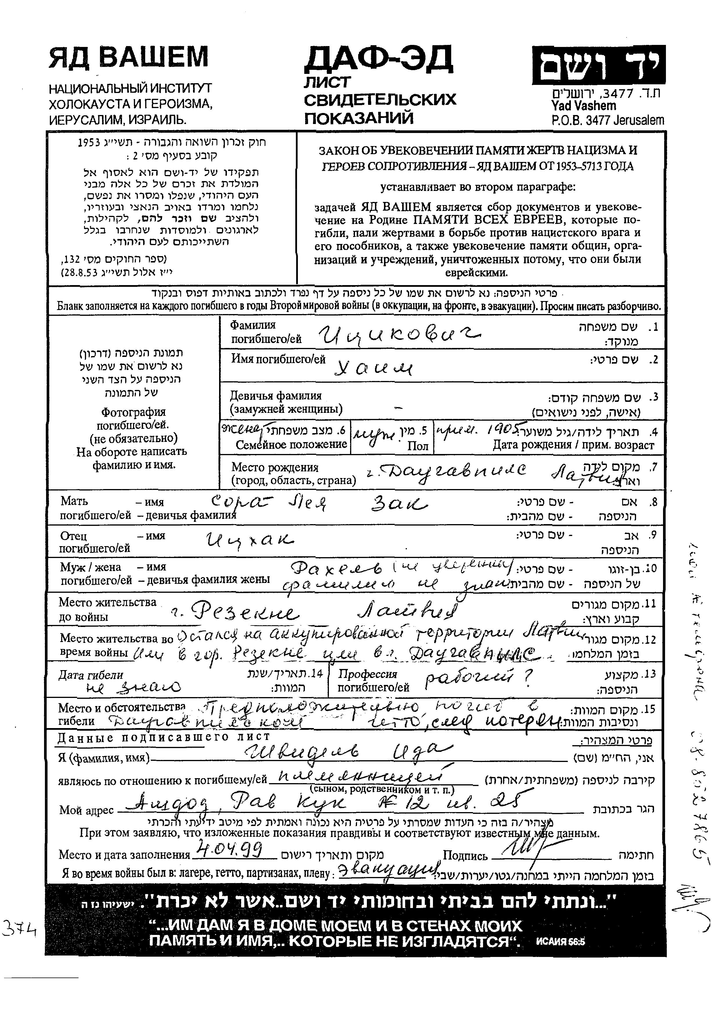 Haim Itzikovich נולד בDaugavpils שבלטביה בשנת 1905 לIcchak וSora Leya. הוא היה פועל ונשוי לRahel. לפני מלחמת העולם השניה התגורר בRēzekne שבלטביה. בזמן המלחמה הוא היה בDaugavpils שבלטביה. הוא נרצח בשואה. מקום המוות: Daugavpils שבלטביה.