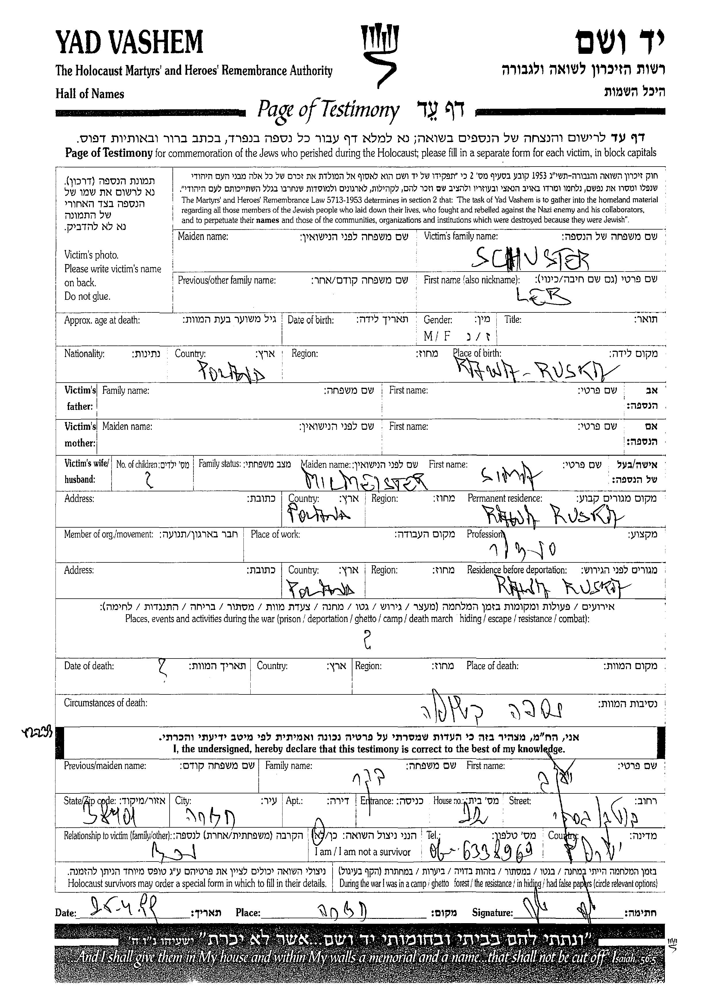Leb Schuster נולד בRawa Ruska שבפולין. הוא היה סנדלר. לפני מלחמת העולם השניה התגורר בRawa Ruska שבפולין. בזמן המלחמה הוא היה בRawa Ruska שבפולין. הוא נרצח בשואה.