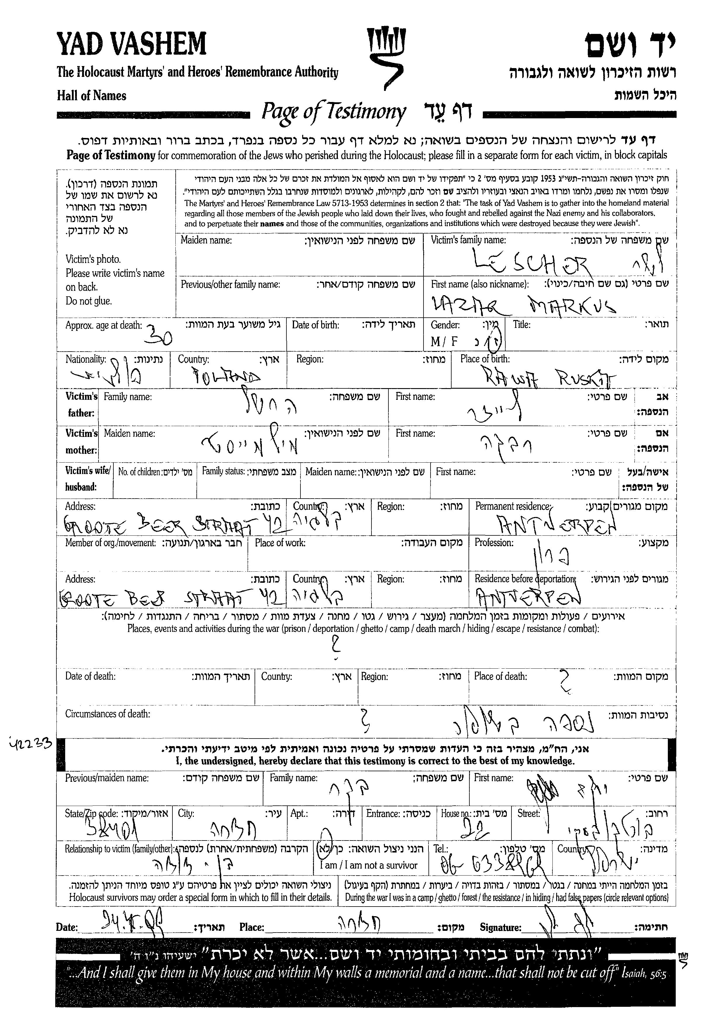 לזר מרקוס Lescher נולד בRawa Ruska שבפולין ללייזר הרשל ורבקה. הוא היה פרוון. לפני מלחמת העולם השניה התגורר בAntwerpen שבבלגיה. בזמן המלחמה הוא היה בAntwerpen שבבלגיה. לזר מרקוס נרצח בשואה.