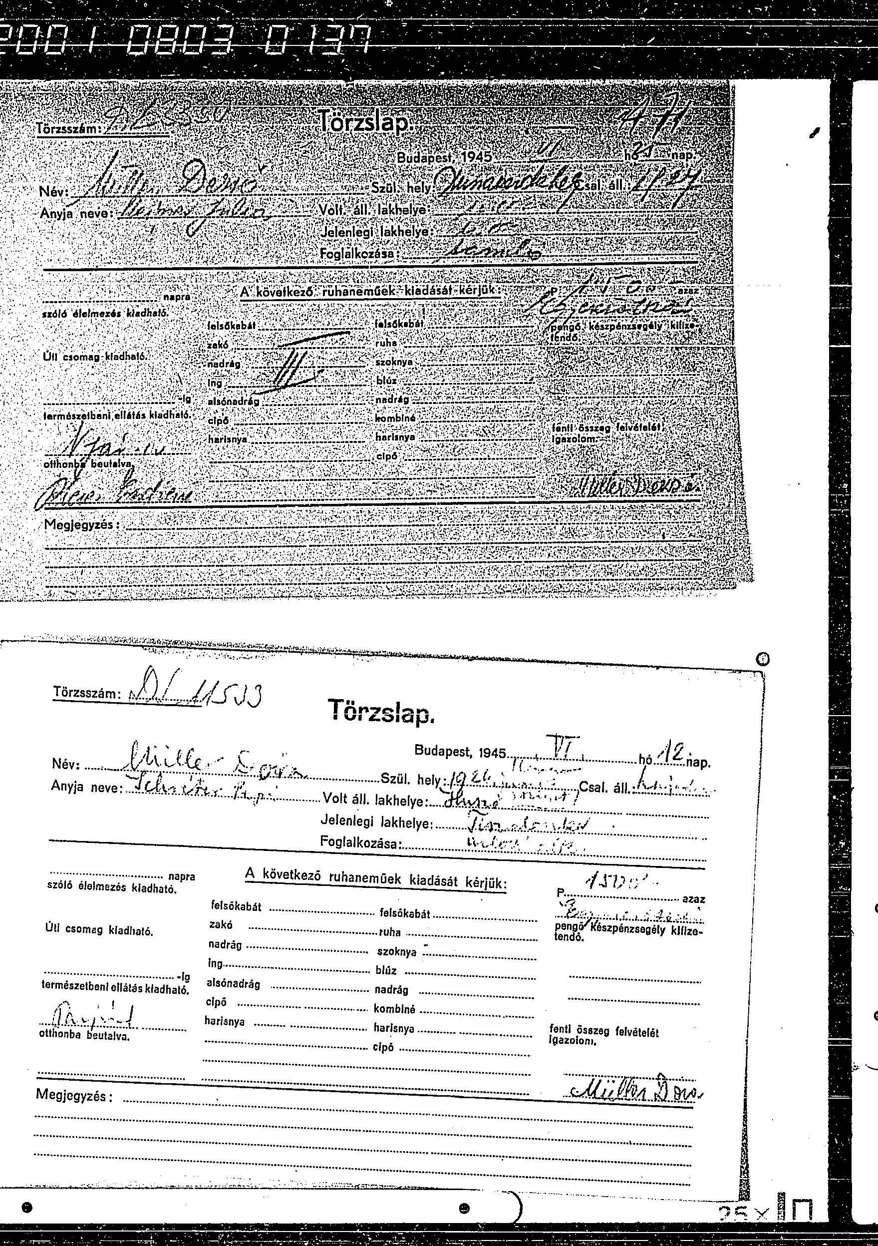 כרטסת של שמות ניצולים שחזרו להונגריה בשנים 1945-1946 שהכינה DEGOB