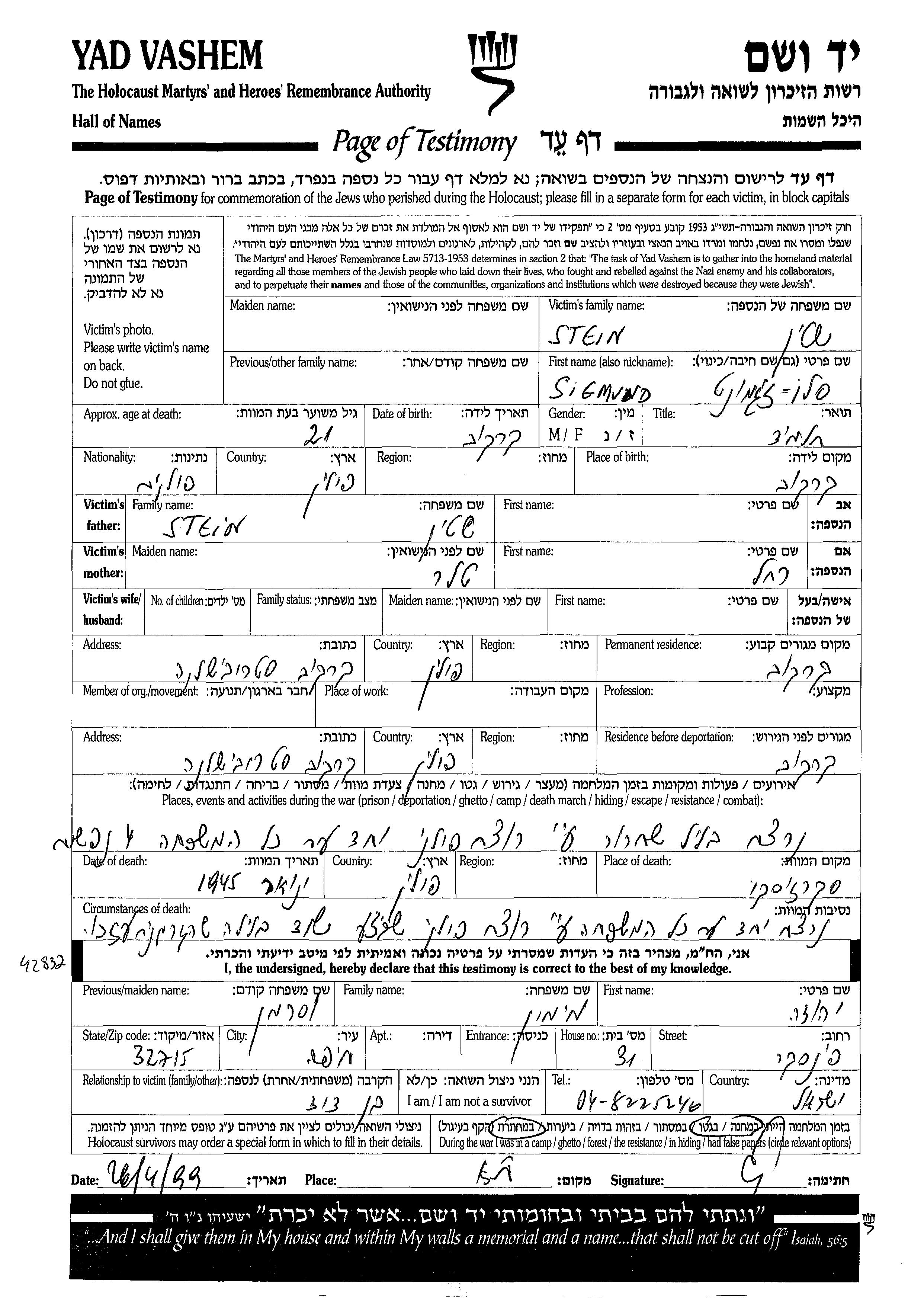 סיגמונד סלו Stein נולד בKrakow שבפולין לרחל. הוא היה תלמיד. לפני מלחמת העולם השניה התגורר בKrakow שבפולין. בזמן המלחמה הוא היה בKrakow שבפולין.