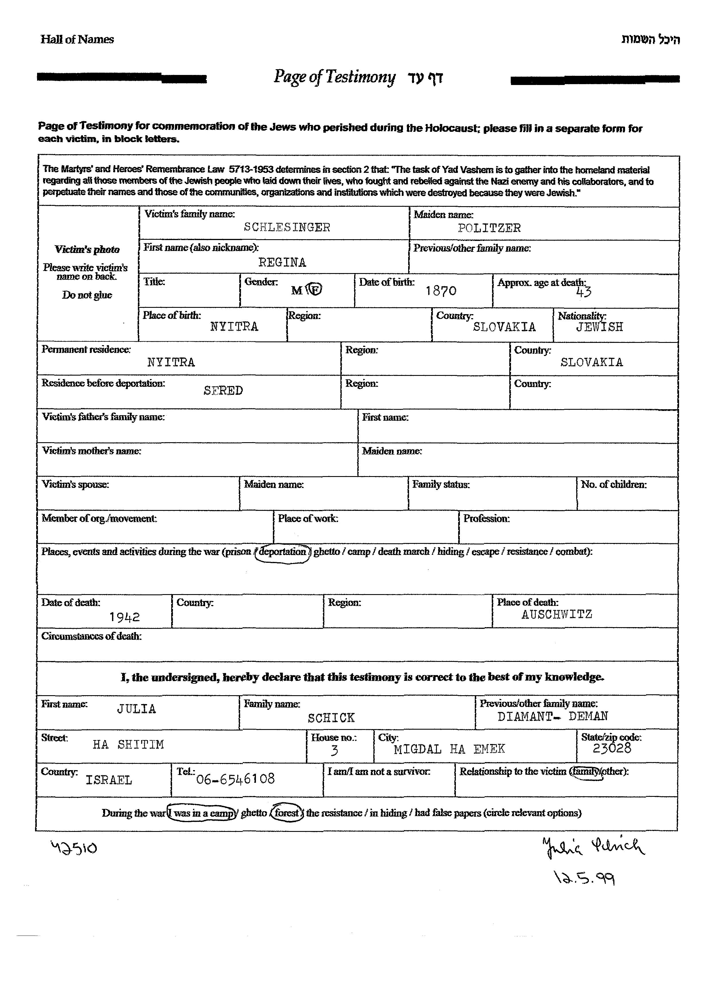 רגינה Schlesinger לבית פוליצר נולדה בSlovakia שבצ'כוסלובקיה בשנת 1870. לפני מלחמת העולם השניה התגוררה בSlovakia שבצ'כוסלובקיה.