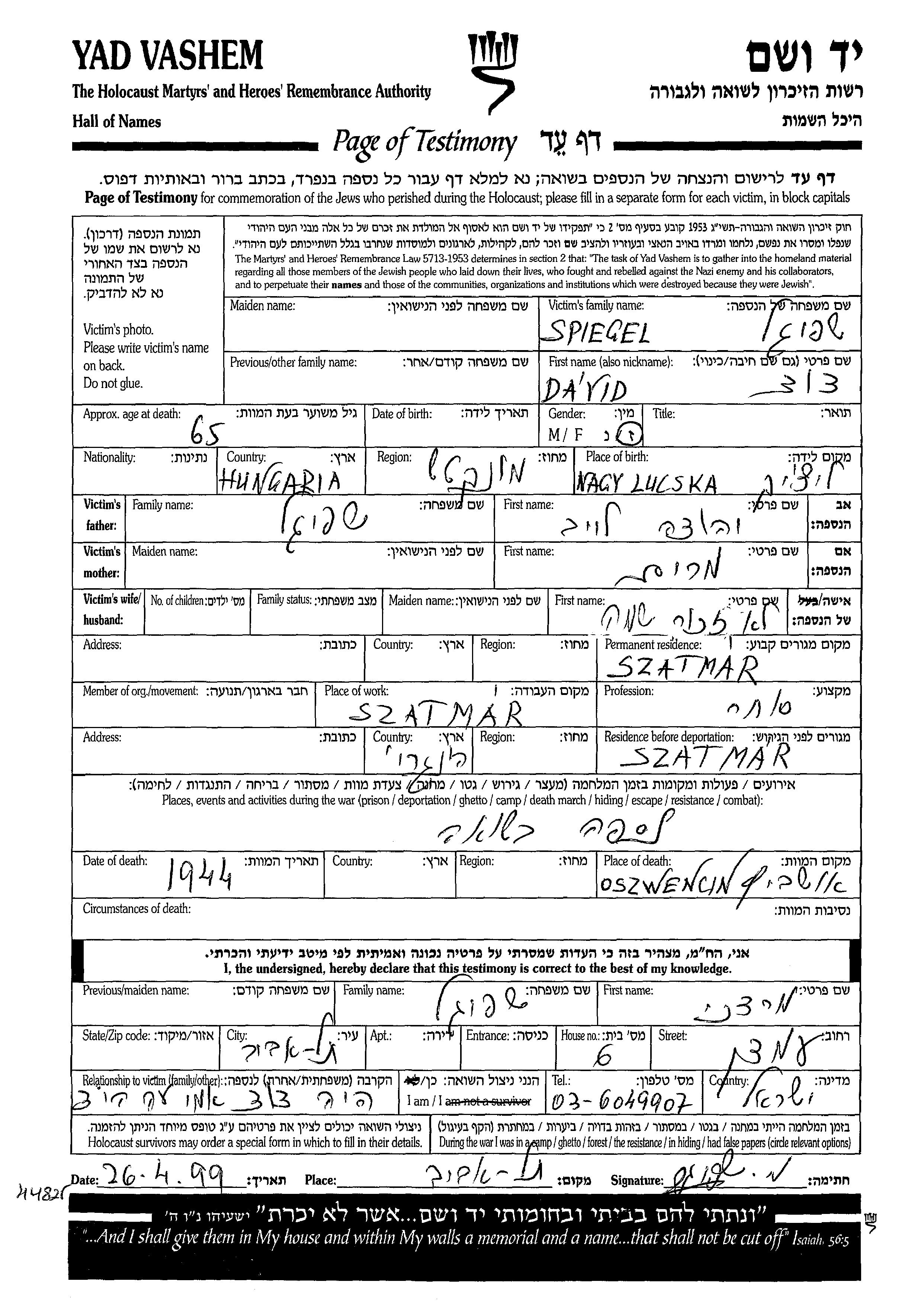 דוד Spiegel נולד בLucska שבצ'כוסלובקיה ליהודה לייב ומרים. הוא היה סוחר. לפני מלחמת העולם השניה התגורר בSzatmarnemeti שברומניה. בזמן המלחמה הוא היה בSzatmarnemeti שברומניה.