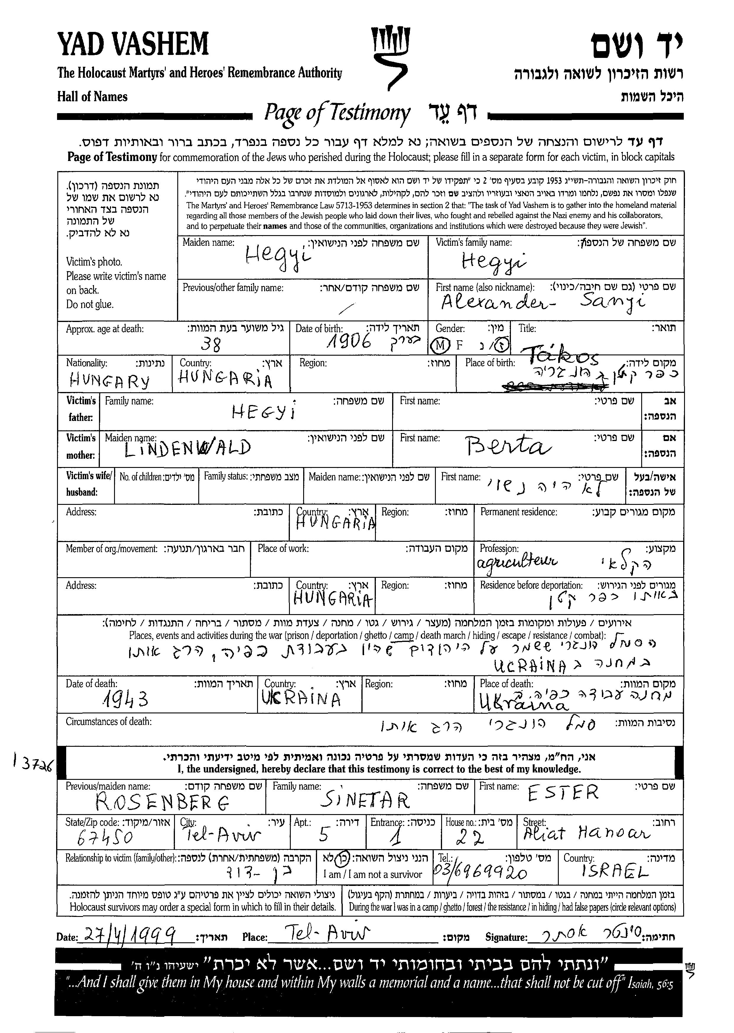 Alexander Hegyi נולד בTakos שבהונגריה בשנת 1906 לברטה. הוא היה חקלאי ורווק. לפני מלחמת העולם השניה התגורר בהונגריה שבהונגריה. בזמן המלחמה הוא היה בTakos שבהונגריה. הוא נרצח בשואה. מקום המוות: אוקראינה (ברה"מ) שבאוקראינה (ברה"מ) בשנת 1943.
