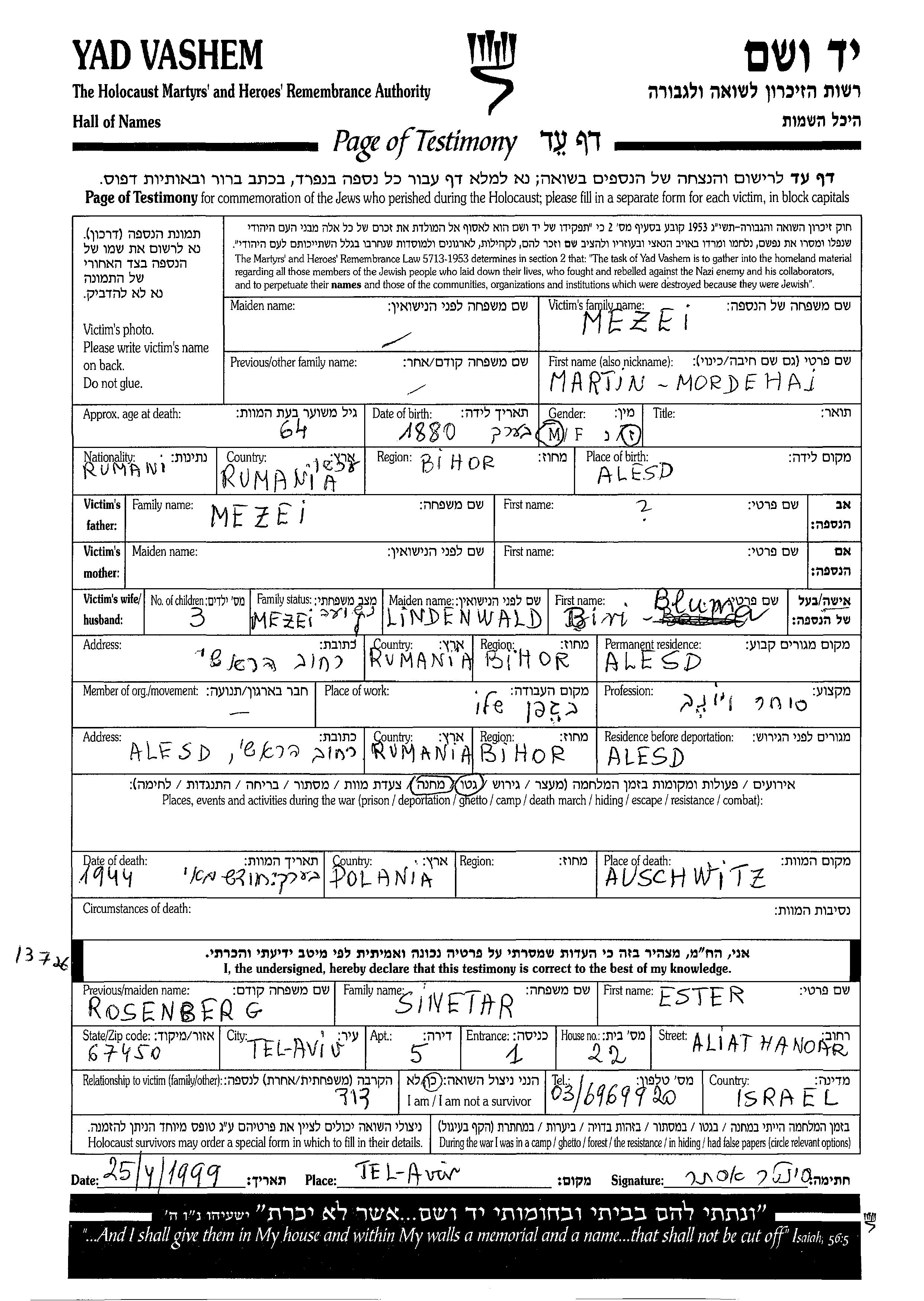 מרטין Mordehaj מזיי נולד בAlesd שברומניה בשנת 1880. הוא היה סוחר יינות ונשוי לBiri בלומה לבית Lindenwald. לפני מלחמת העולם השניה התגורר בAlesd שברומניה. בזמן המלחמה הוא היה בAlesd שברומניה. מרטין Mordehaj נרצח בשואה. מקום המוות: Auschwitz שבפולין בשנת 04/1944.