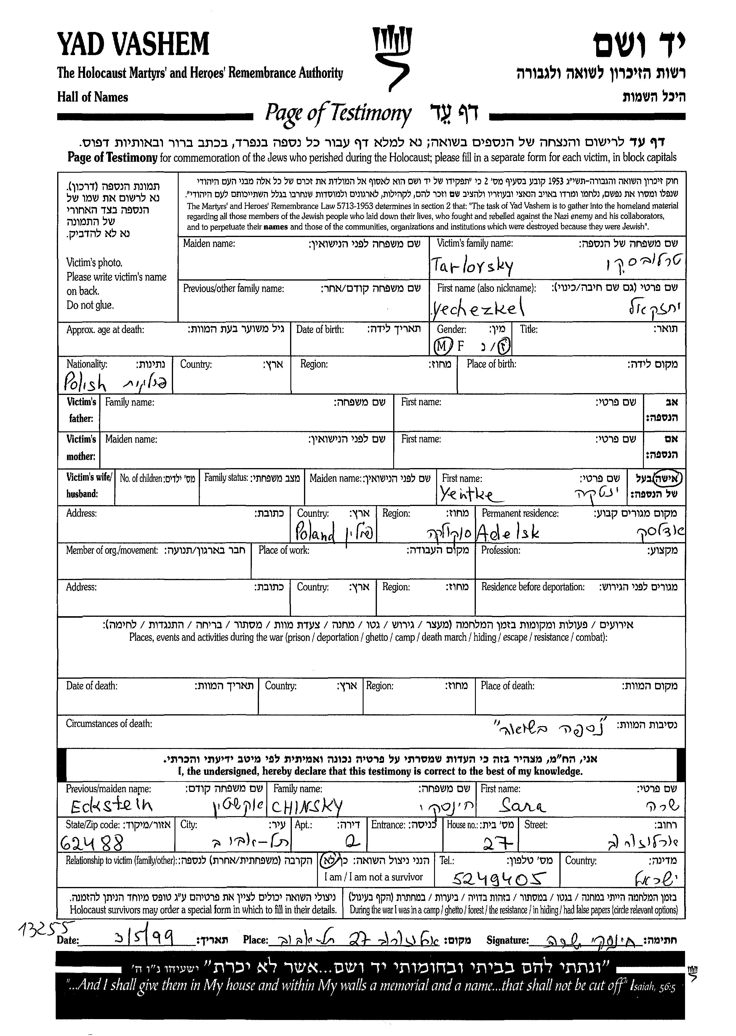 Jechezkel טרלובסקי. לפני מלחמת העולם השניה התגורר בAdelsk שבפולין.
