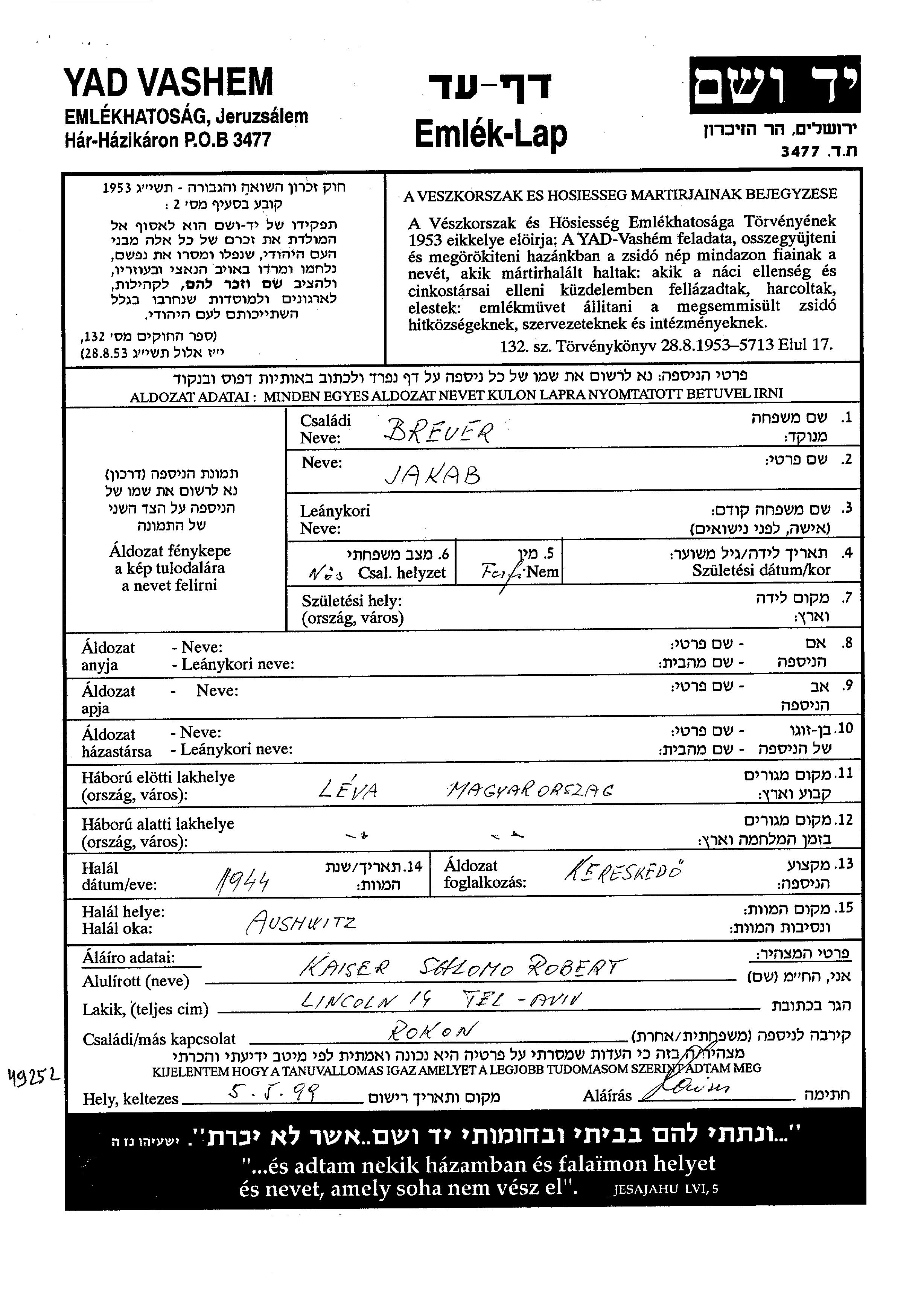 Jakab Breuer. הוא היה סוחר ונשוי. לפני מלחמת העולם השניה התגורר בLeva שבצ'כוסלובקיה.