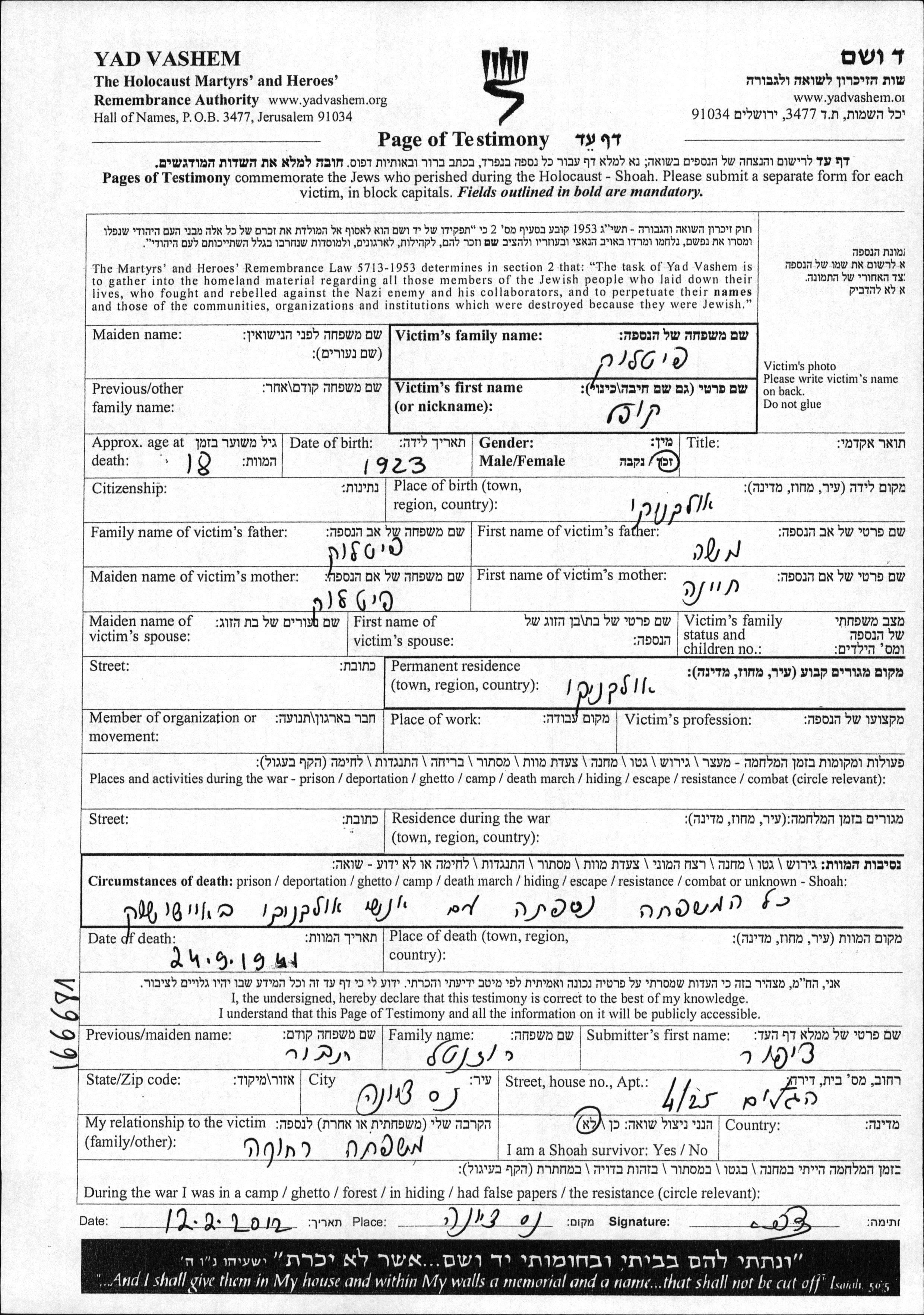 קופל נרצח בשואה. מקום המוות: Ayshishok שבפולין בשנת 24/09/1941.
