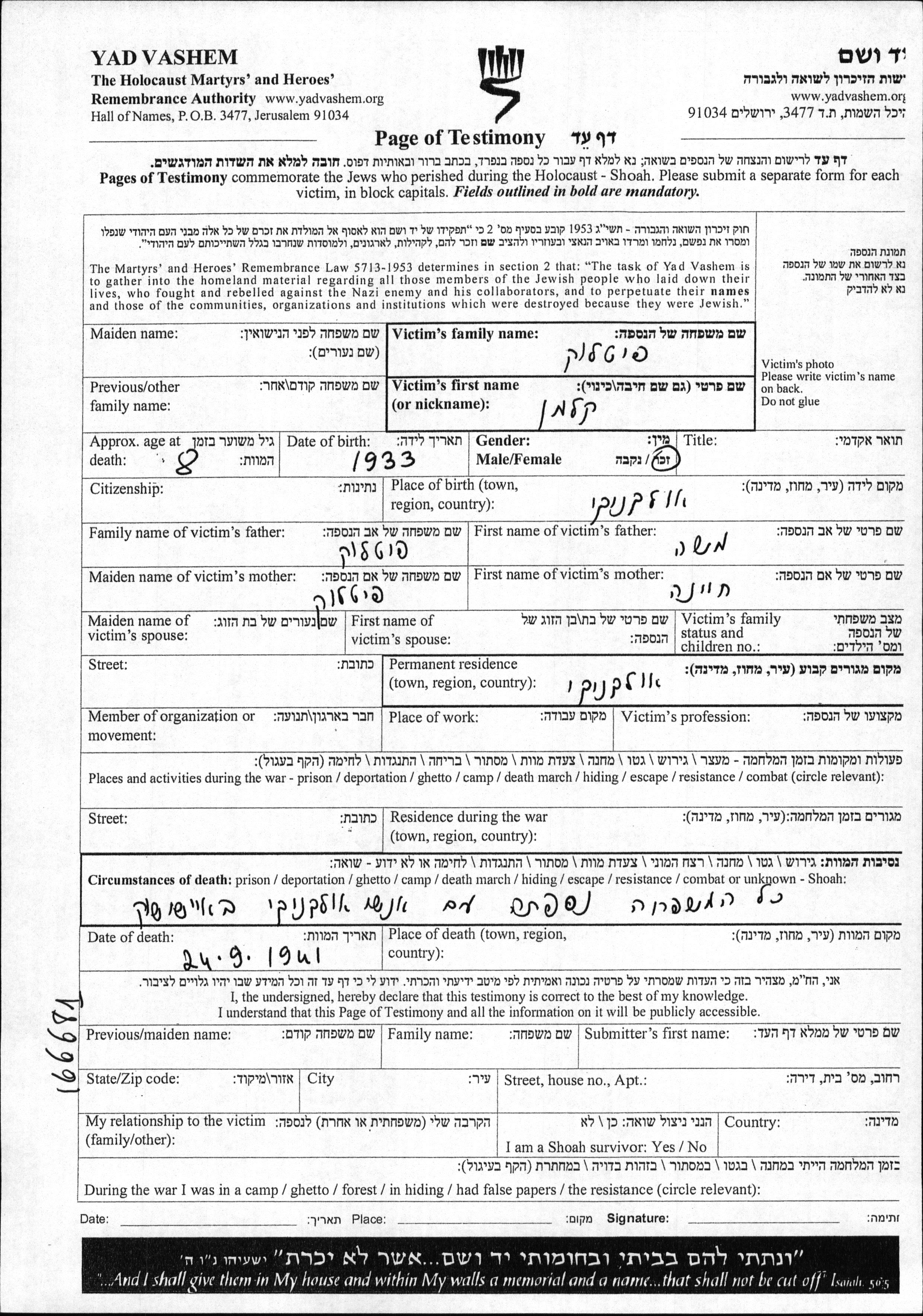 קלמן נרצח בשואה. מקום המוות: Eishishok שבפולין בשנת 24/09/1941.