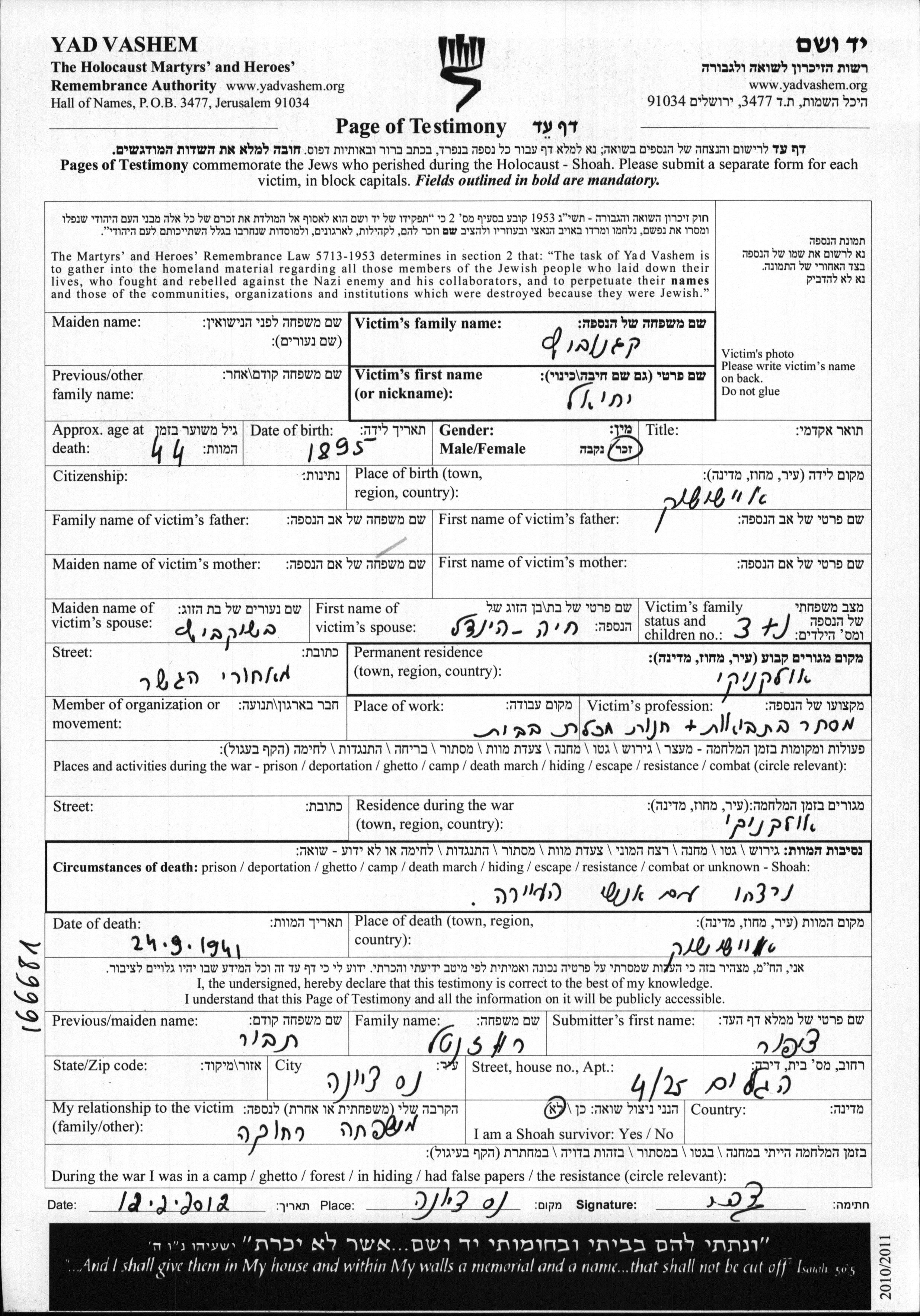יחיאל קגנוביץ נולד בEishishok שבפולין בשנת 1895. הוא היה סוחר תבואה ונשוי לחיה הינדה לבית בשוקביץ. לפני מלחמת העולם השניה התגורר בOlkieniki שבפולין. בזמן המלחמה הוא היה בOlkieniki שבפולין. יחיאל נרצח בשואה. מקום המוות: Eishishok שבפולין בשנת 24/09/1941.