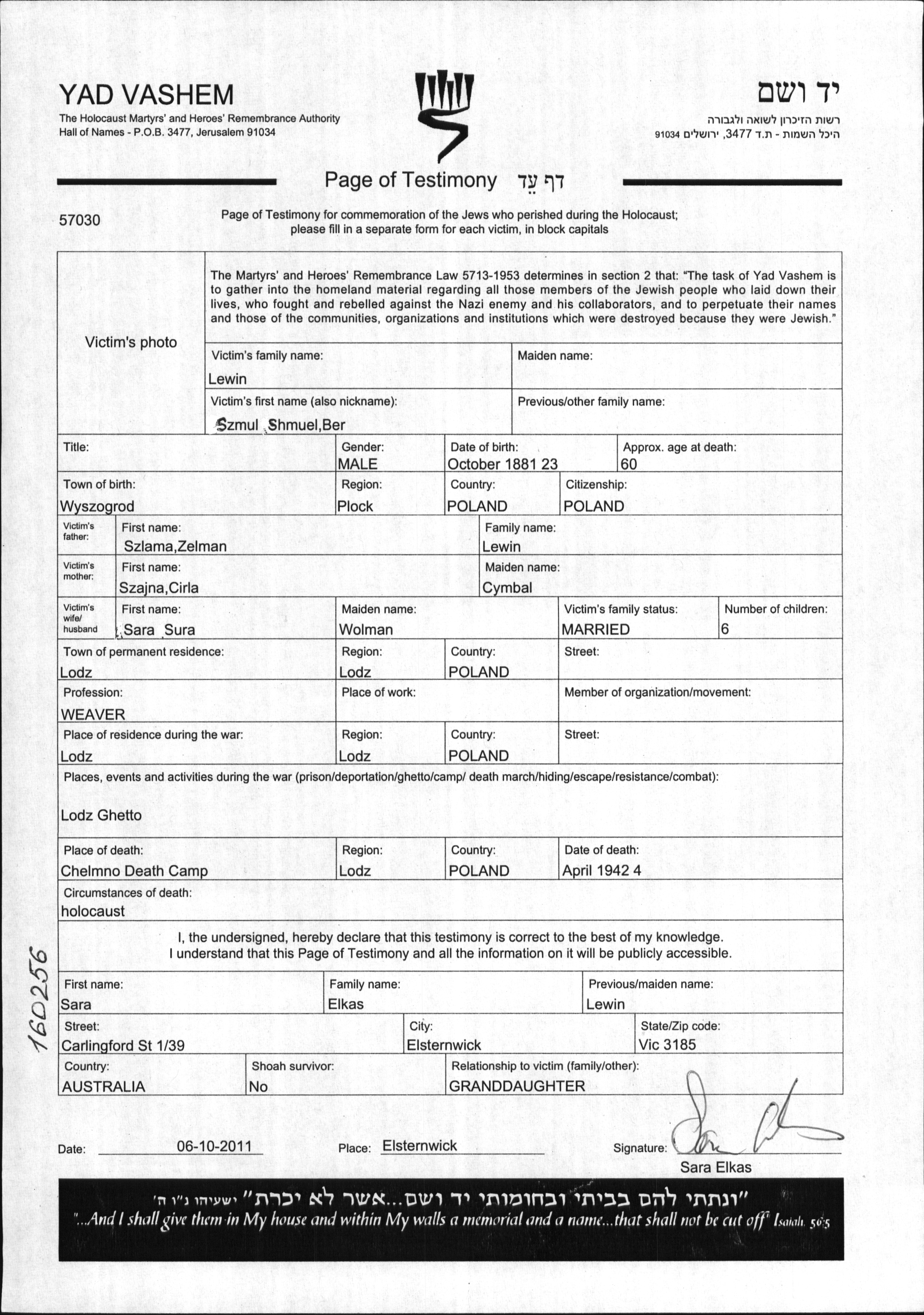 Szmul בר Lewin נולד בWyszogrod שבפולין בשנת 1881 לSzlama זלמן וSzajna Cirla לבית Cymbal. הוא היה אורג טקסטיל ונשוי לשרה לבית Wolman. לפני מלחמת העולם השניה התגורר בLodz שבפולין. בזמן המלחמה הוא היה בLodz שבפולין. הוא נרצח בשואה. מקום המוות: Chelmno שבפולין בשנת 04/04/1942.