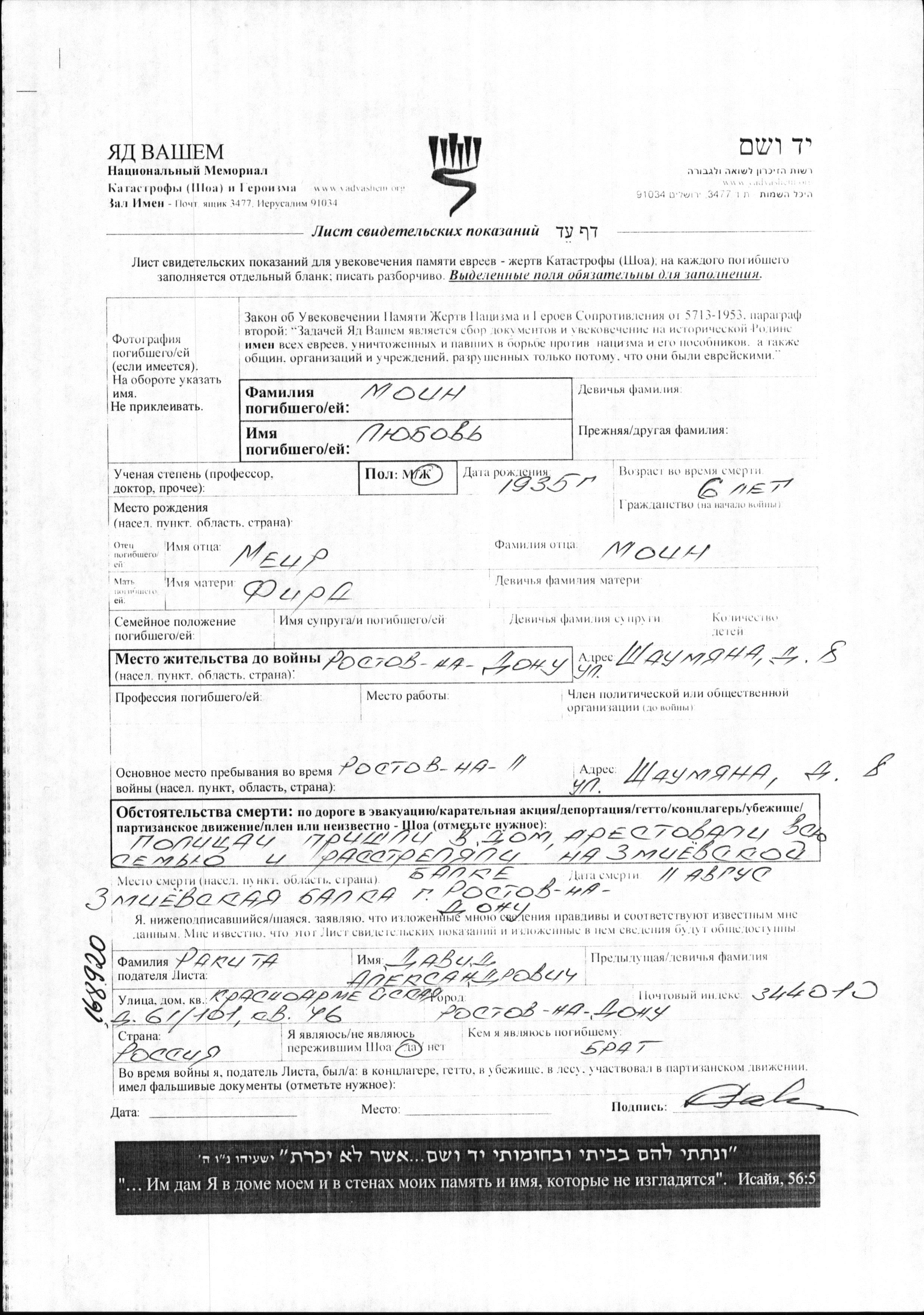Lyubov מוין נולדה בשנת 1935 למאיר וFira. היא היתה ילדה. לפני מלחמת העולם השניה התגוררה בRostov na Donu שברוסיה (ברה"מ). בזמן המלחמה היא היתה בRostov na Donu שברוסיה (ברה"מ). היא נרצחה בשואה. מקום המוות: Zmiyevskaya Balka (Rostov Area) שבאתר רצח בשנת 11/08/1941.