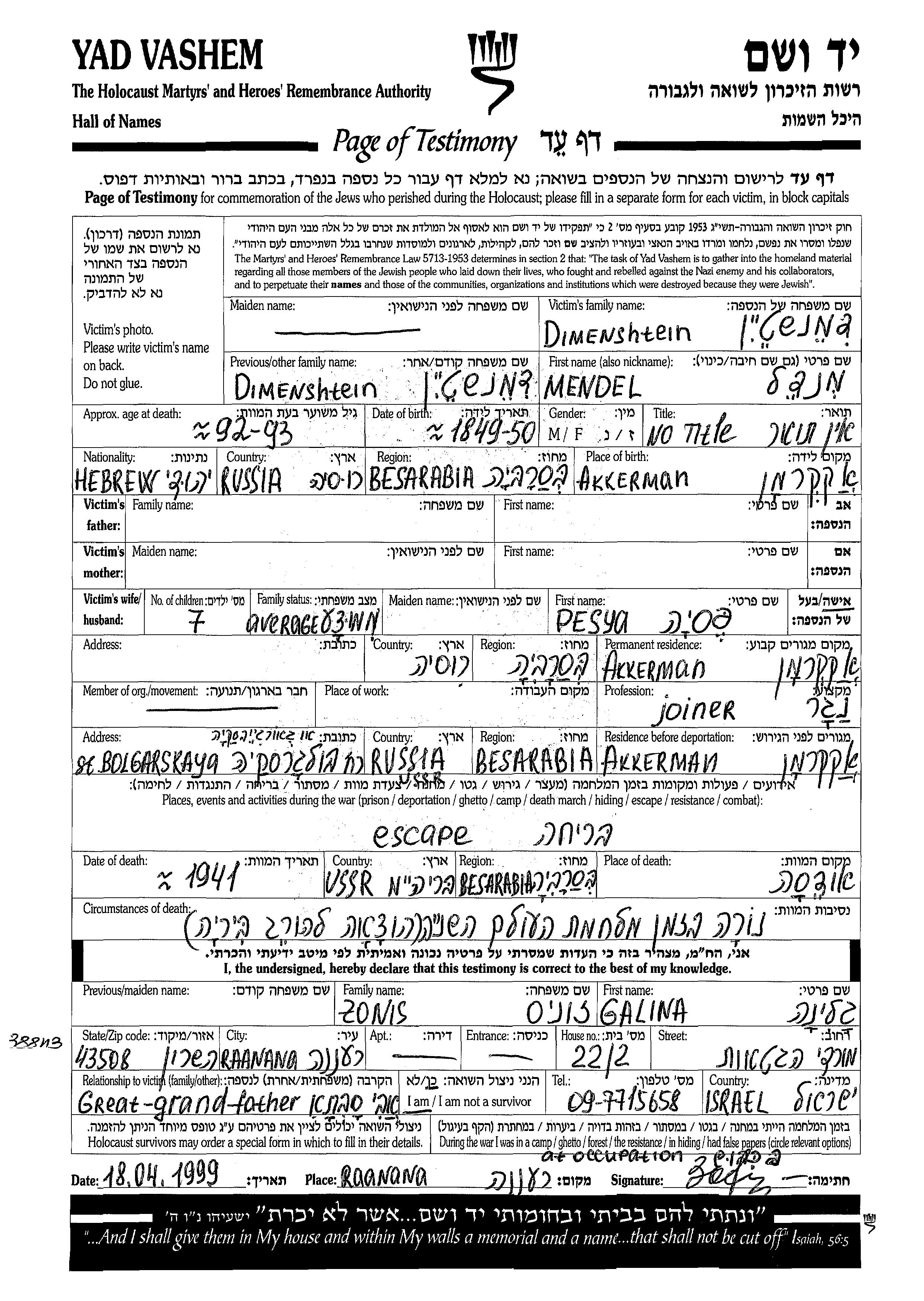 מנדל דימנשטיין נולד בAkkerman שברומניה בשנת 1850. הוא היה נגר ונשוי לPesya. לפני מלחמת העולם השניה התגורר בAkkerman שברומניה. בזמן המלחמה הוא היה בAkkerman שברומניה.