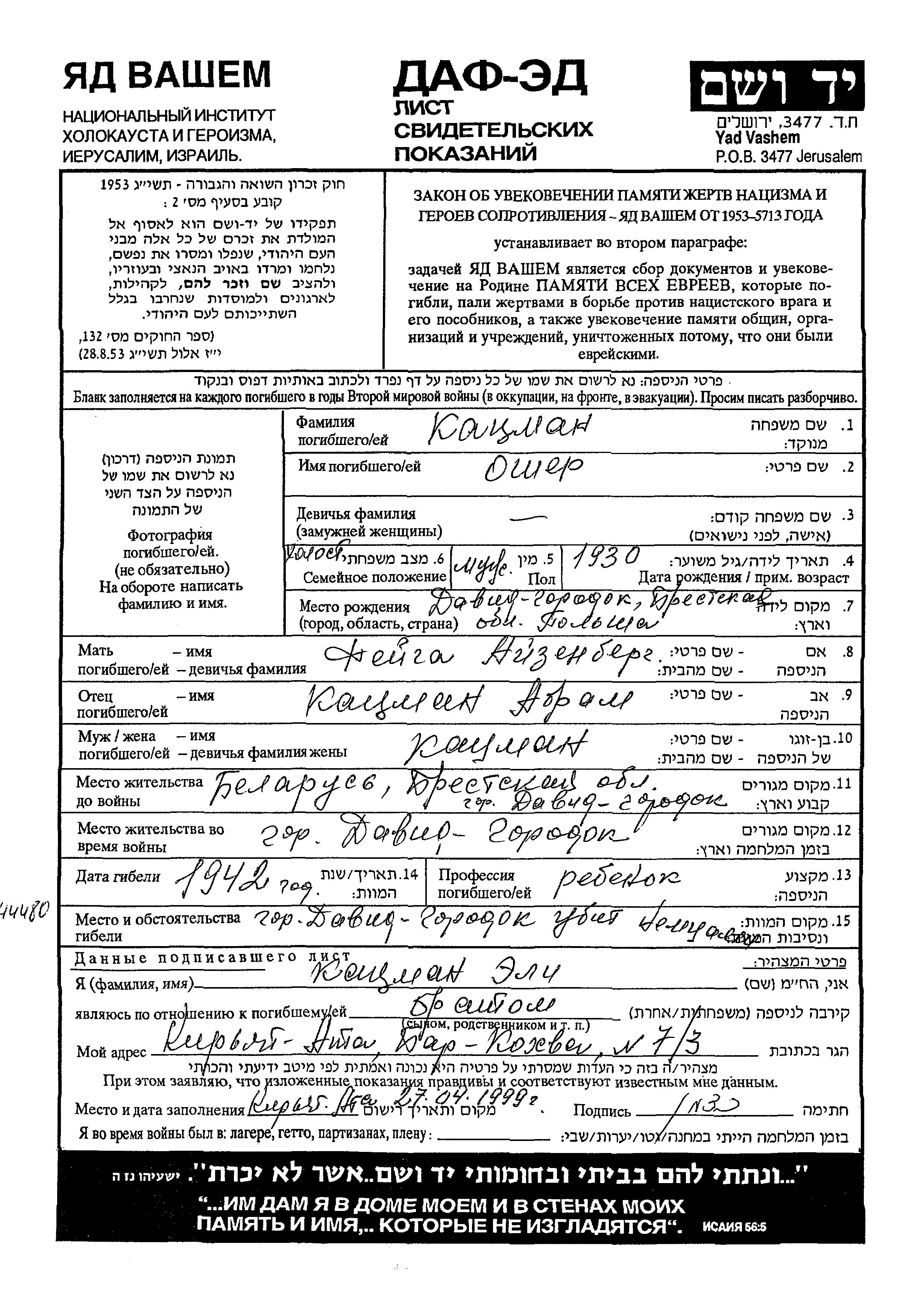 Osher קצמן נולד בDavid Gorodok שבפולין בשנת 1930 לאברם ופייגה. הוא היה רווק. לפני מלחמת העולם השניה התגורר בDavid Gorodok שבפולין. בזמן המלחמה הוא היה בDavid Gorodok שבפולין. הוא נרצח בשואה. מקום המוות: David Gorodok שבפולין בשנת 1942.