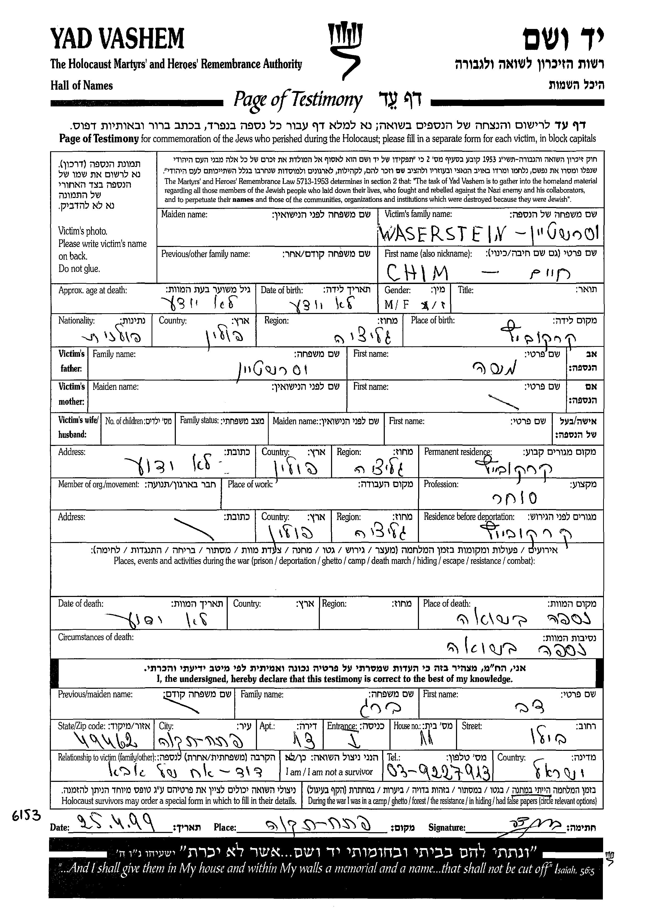 Chim Waserstein נולד בKrakowiec שבפולין למשה. הוא היה סוחר. לפני מלחמת העולם השניה התגורר בKrakowiec שבפולין. בזמן המלחמה הוא היה בKrakowiec שבפולין. הוא נרצח בשואה.