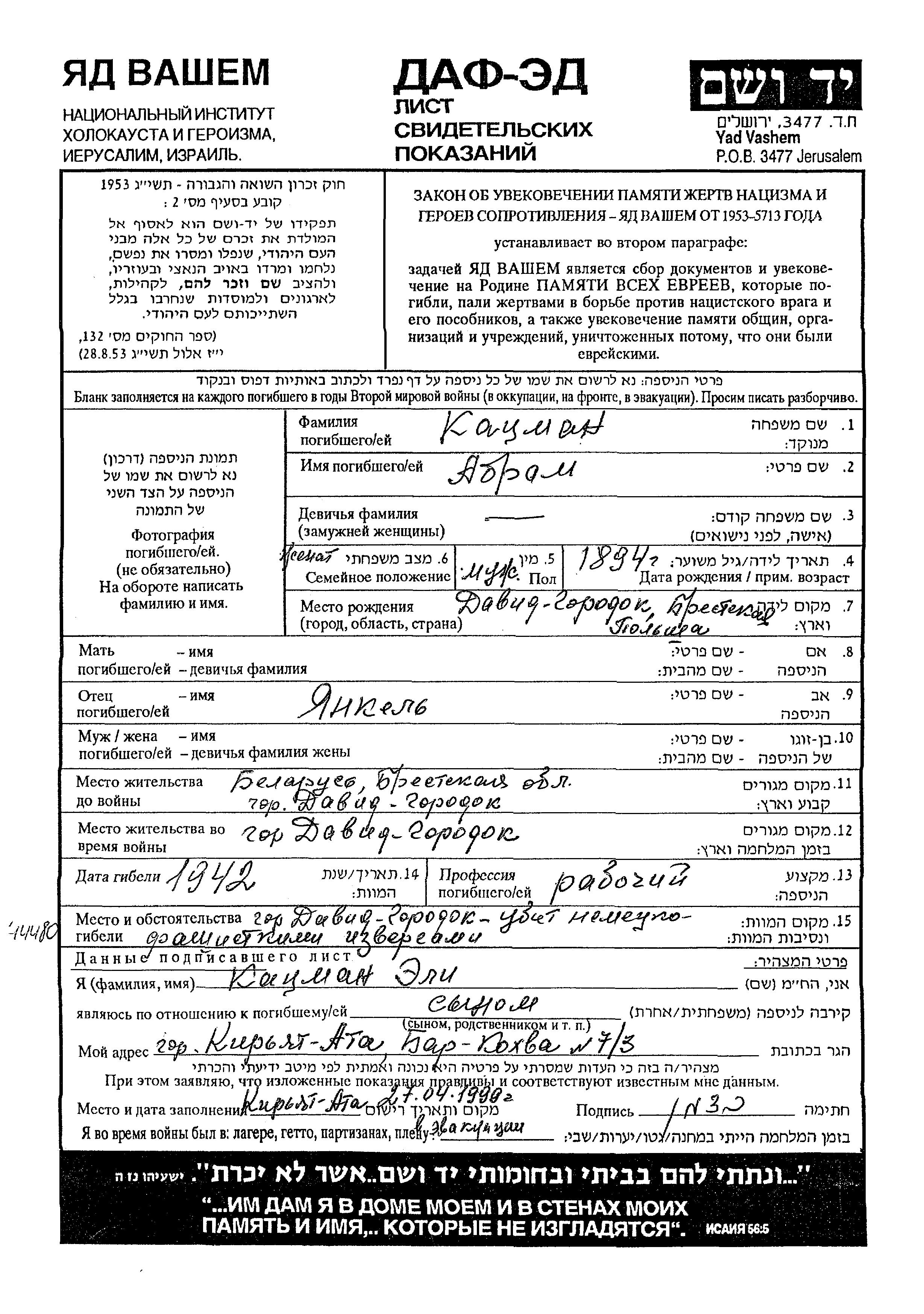 קצמן אברם 1894 David Gorodok, פולין דף-עד