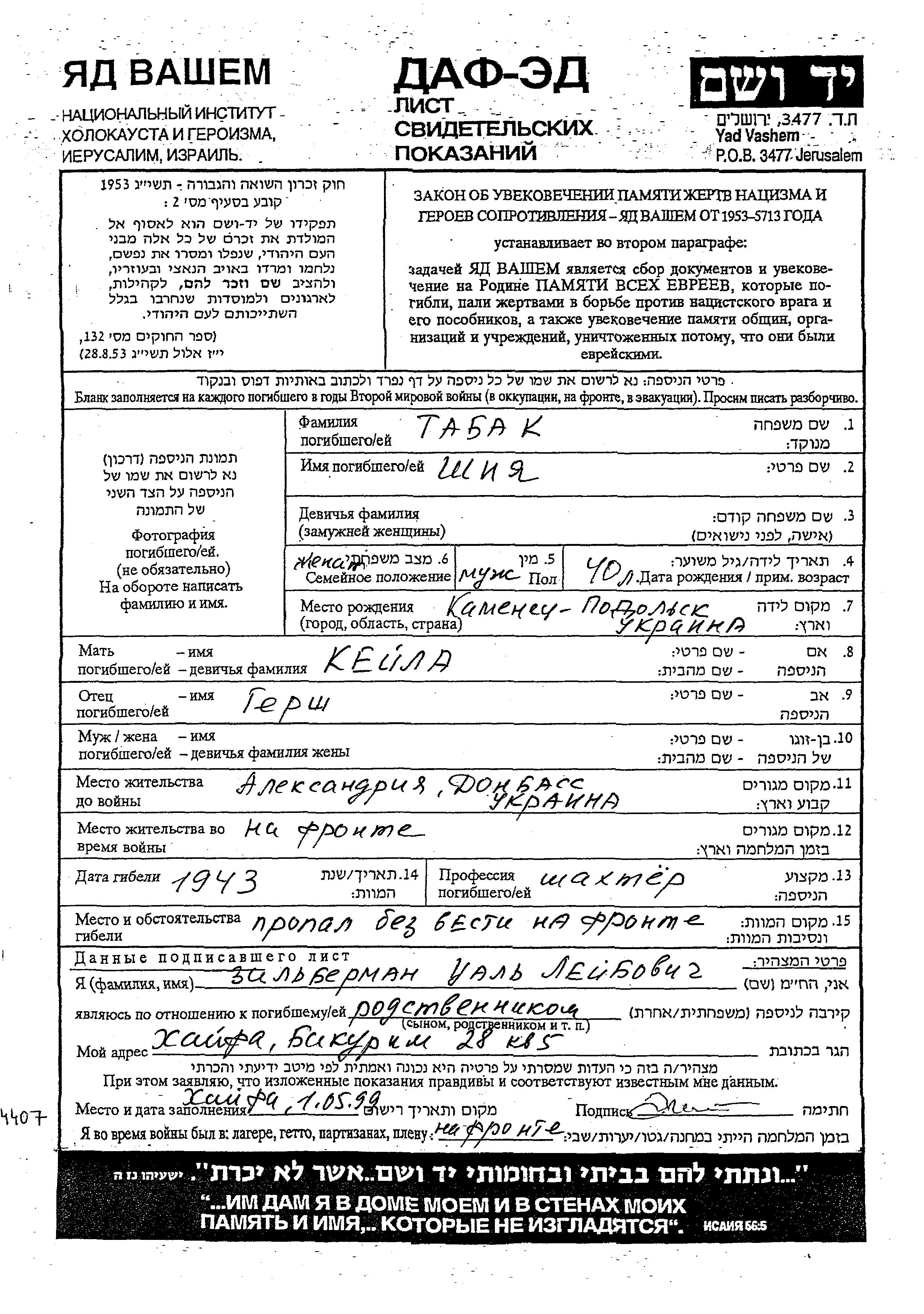 חיפוש שם מוסר דף העד. חיפוש לפי כל שם פרטי, כולל כינוי או שם חיבה
