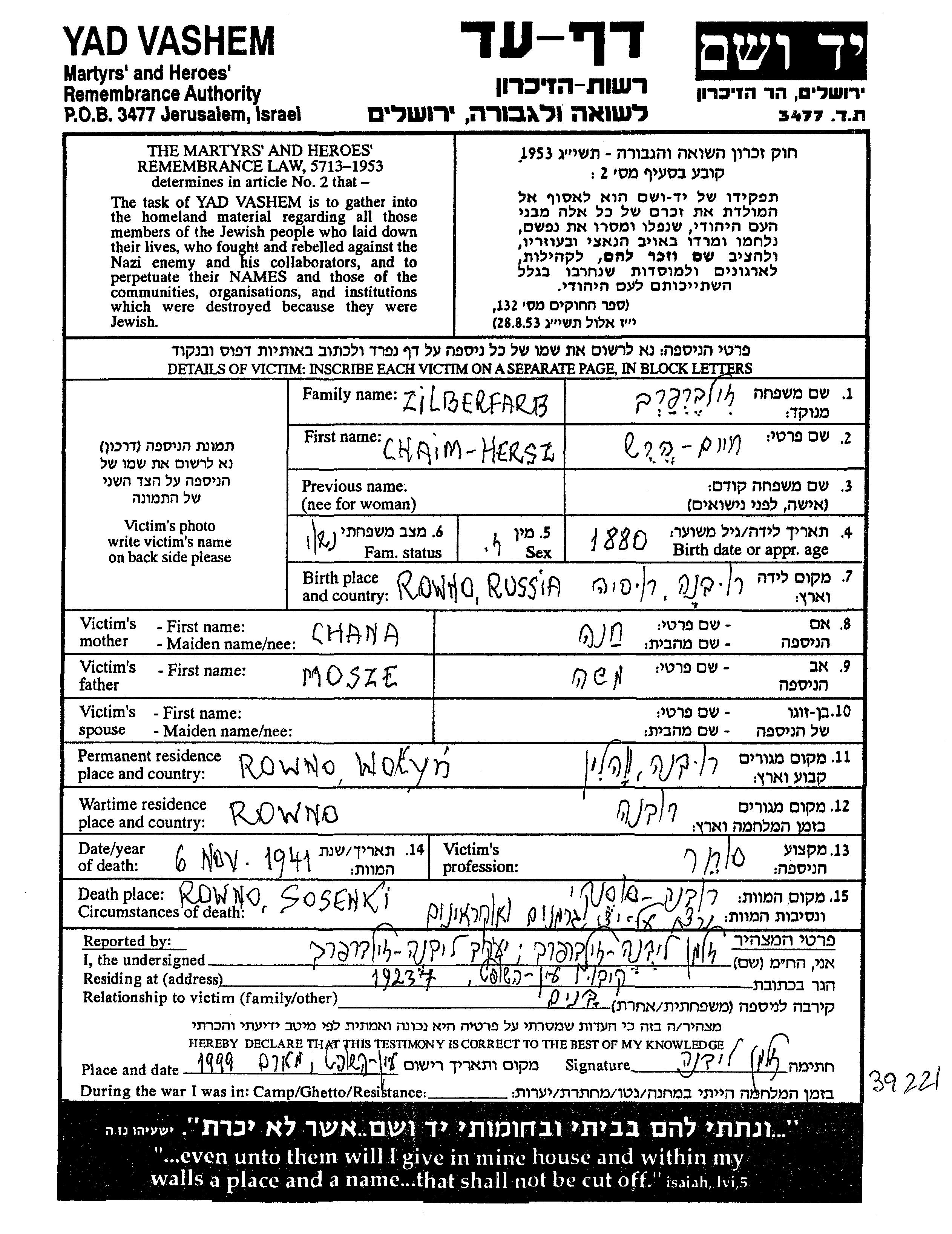 Хаим Герш Зильберфарб, место рождения: Ровно, Польша. Отец: Моше, mать:Хана. Торговец / торговка. Женат / замужем. Место жительства до войны: Ровно, Польша. Место во время войны: Ровно, Польша.