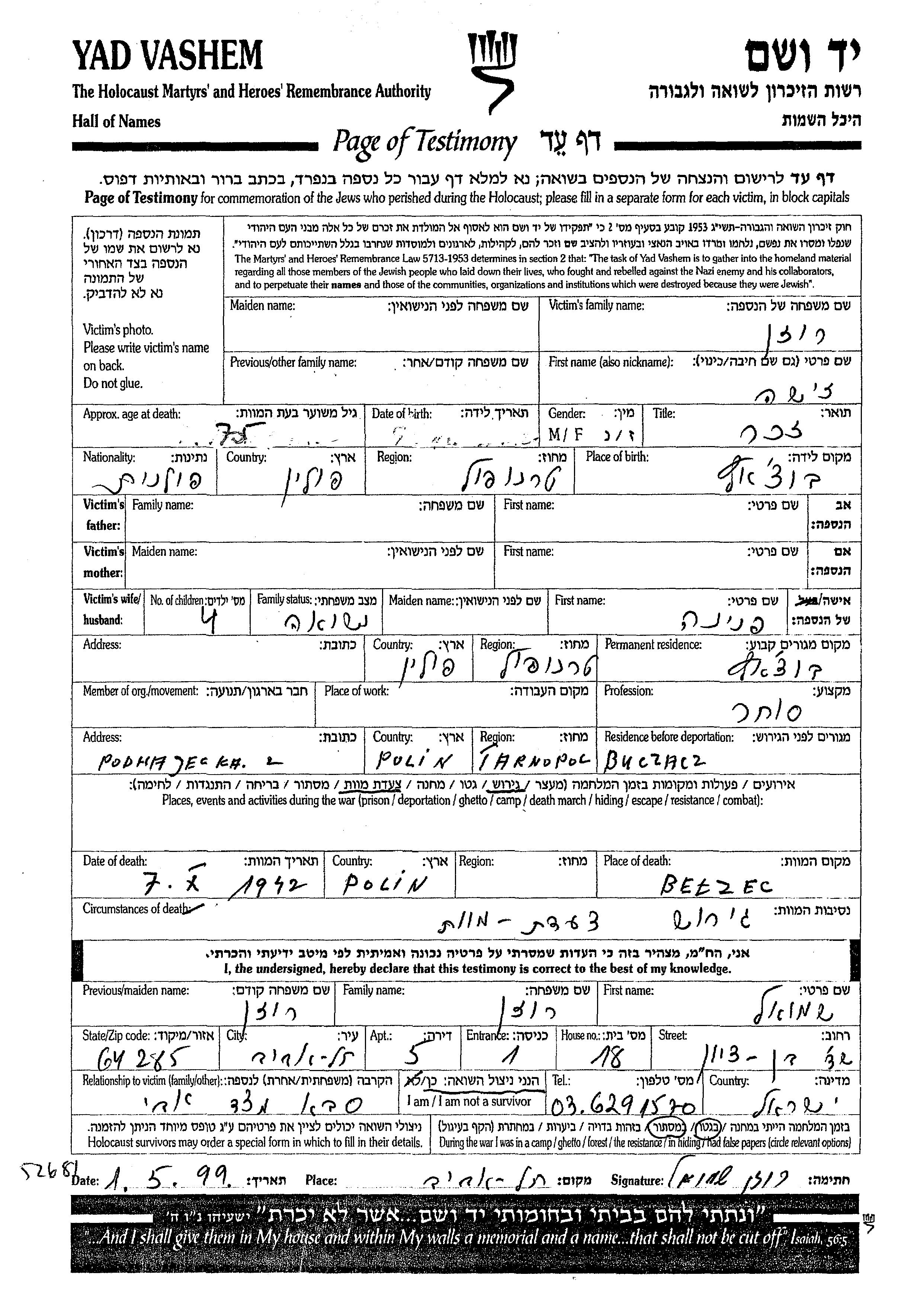 Розен Зиша Бучач, Польша Лист свидетельских показаний