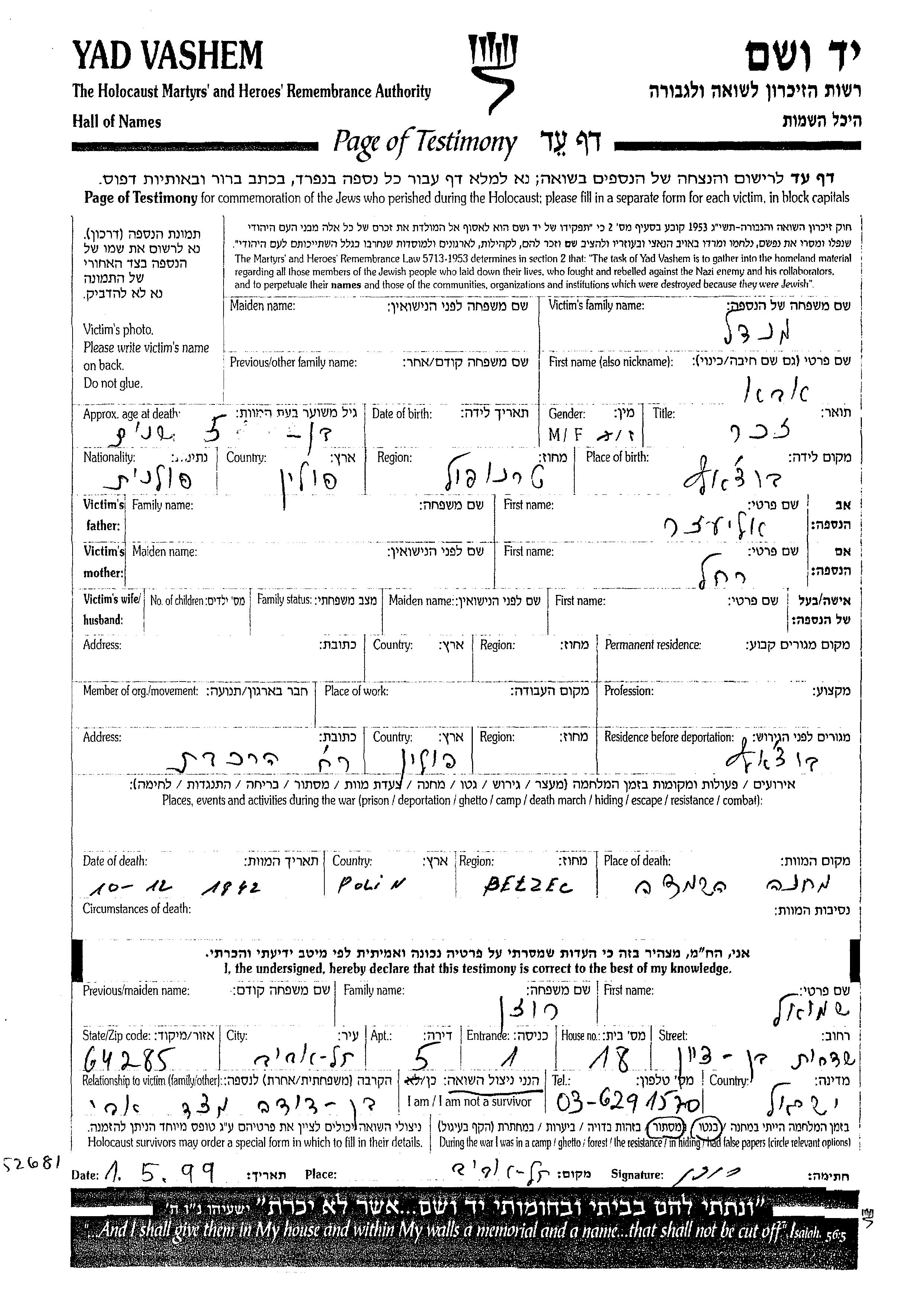 Аба уничтожен в период Шоа. место смерти: Белжец, Польша в 10/12/1942.