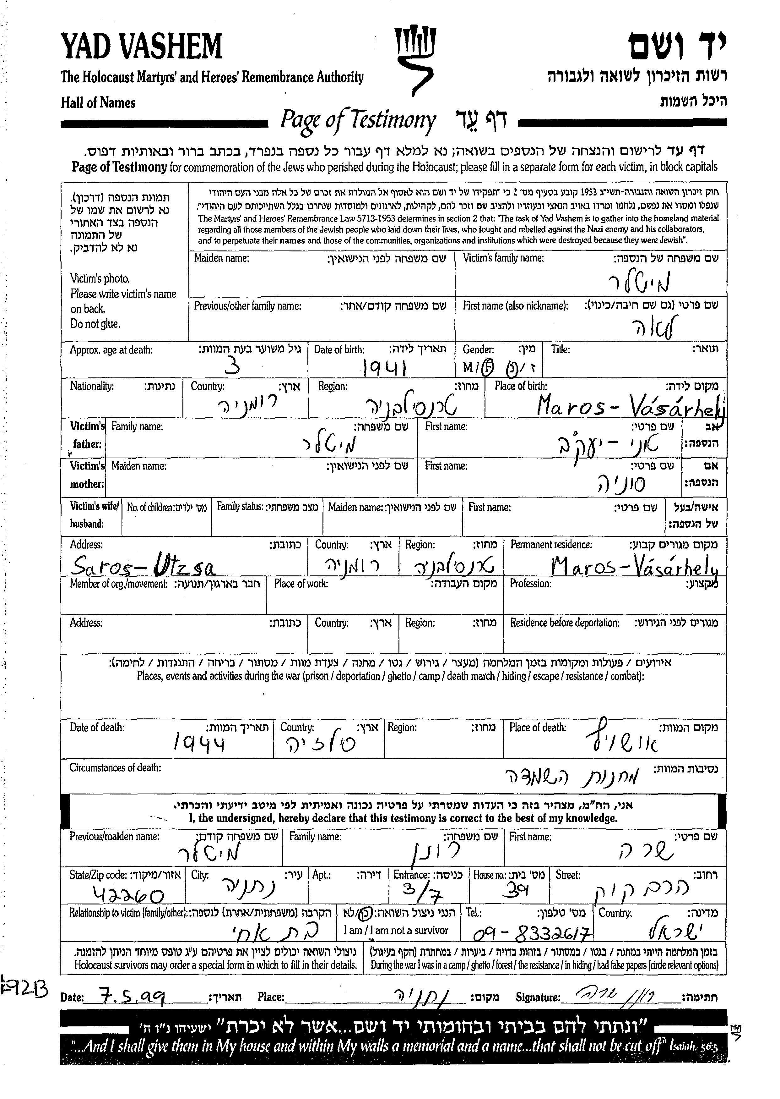 Митлер Лея 1941 Марош-Вашархей, Румыния Лист свидетельских показаний