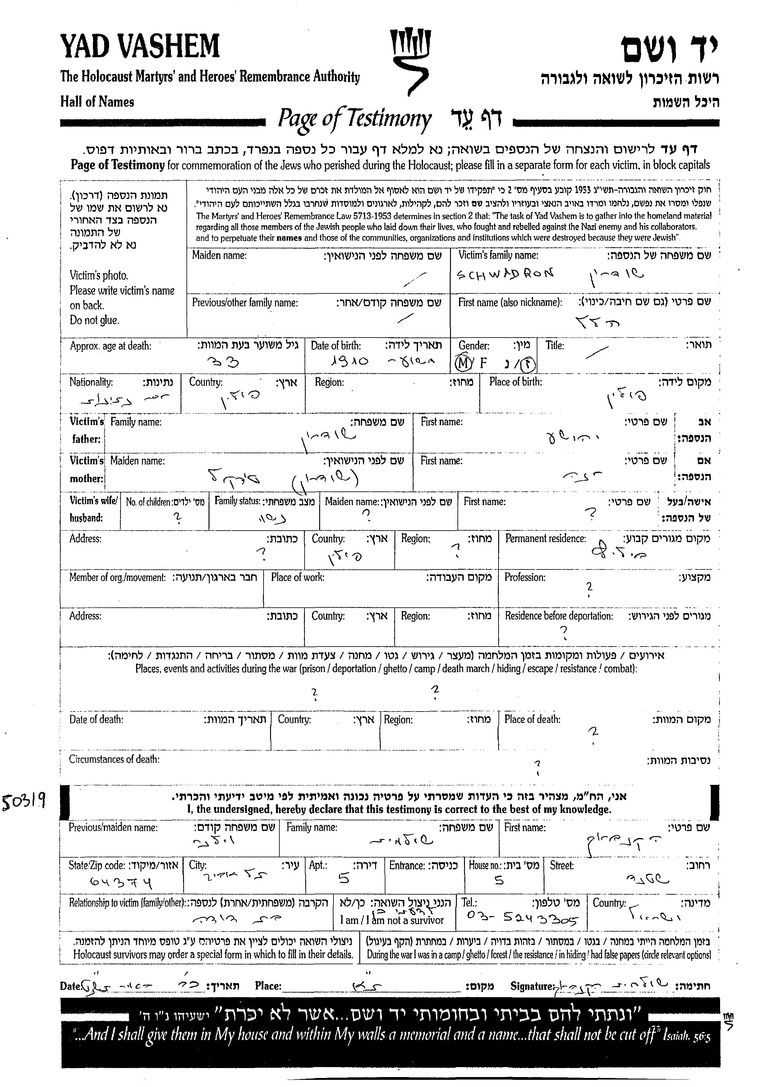 Хилель Швадрон, место рождения: Польша. Отец: Иегошуа, mать:Хана. Женат / замужем. Место жительства до войны: Белиц, Польша.