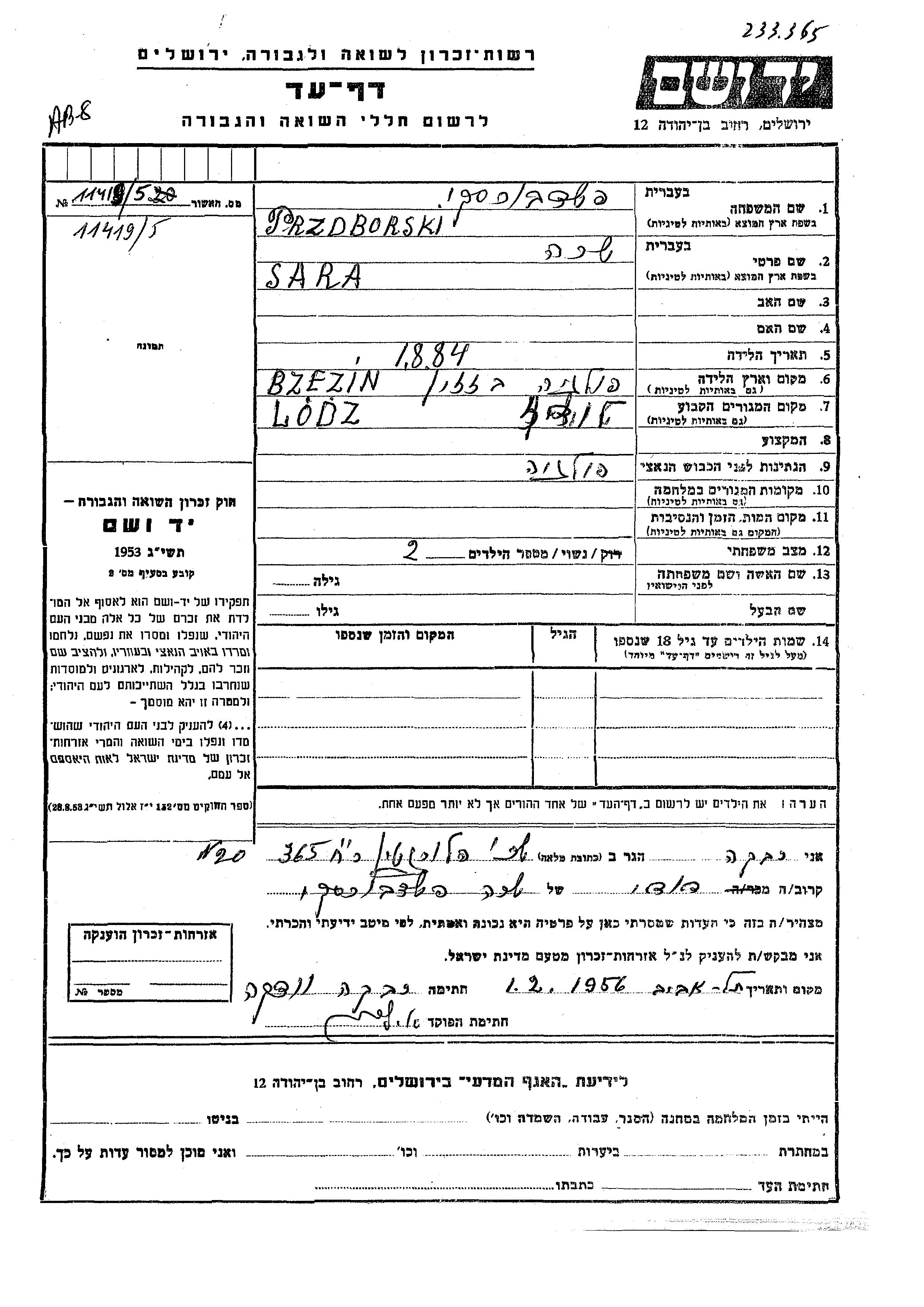 Сара Пшедборски, место рождения: Бжезин, Польша. Женат / замужем. Место жительства до войны: Лодзь, Польша.