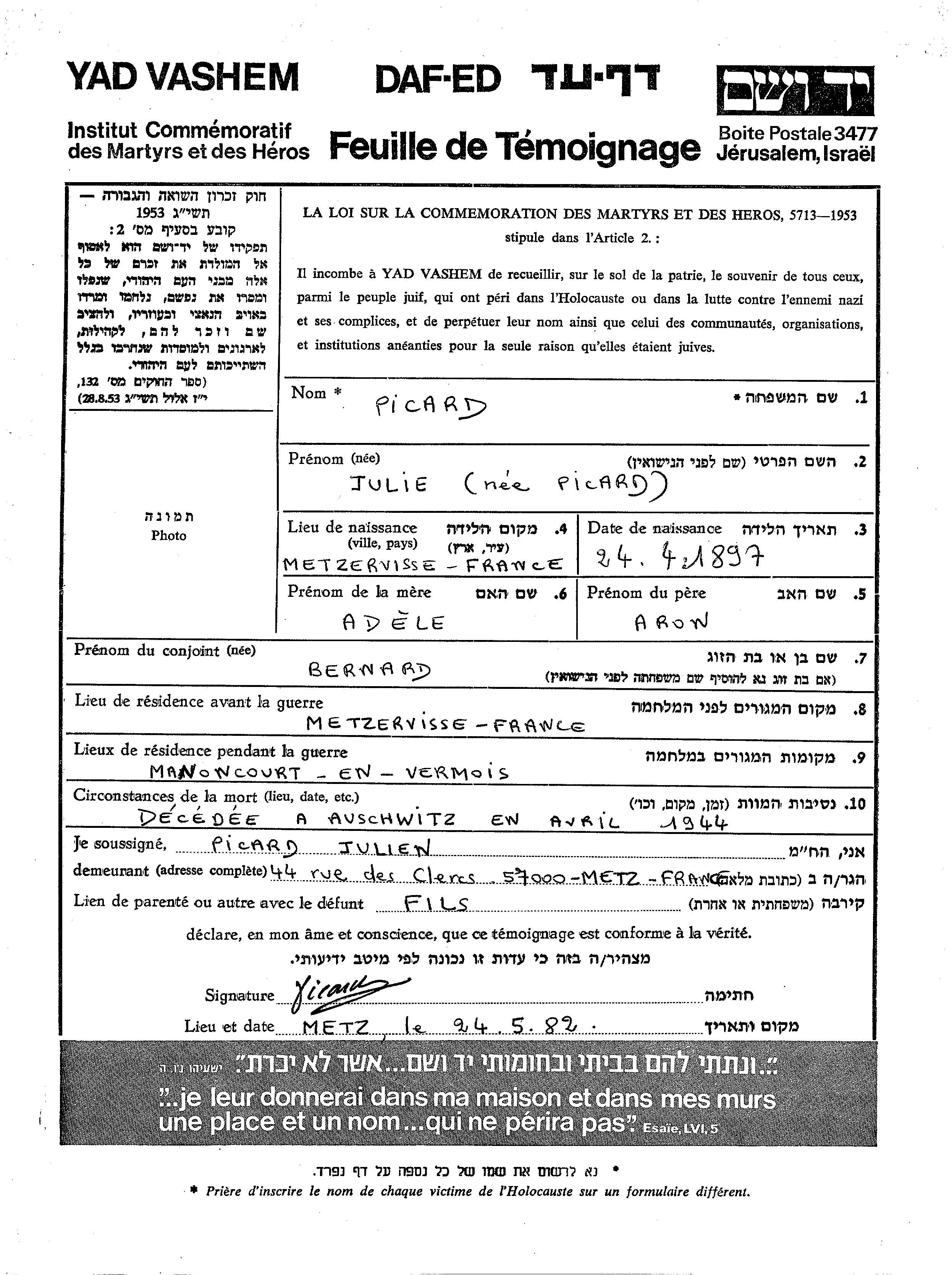 Юли Пикард, место рождения: Мецервис, Франция. Отец: Арон, mать:Аделе. Женат / замужем. Место жительства до войны: Мецервис, Франция. Место во время войны: Manoncourt en Vermois, Франция.