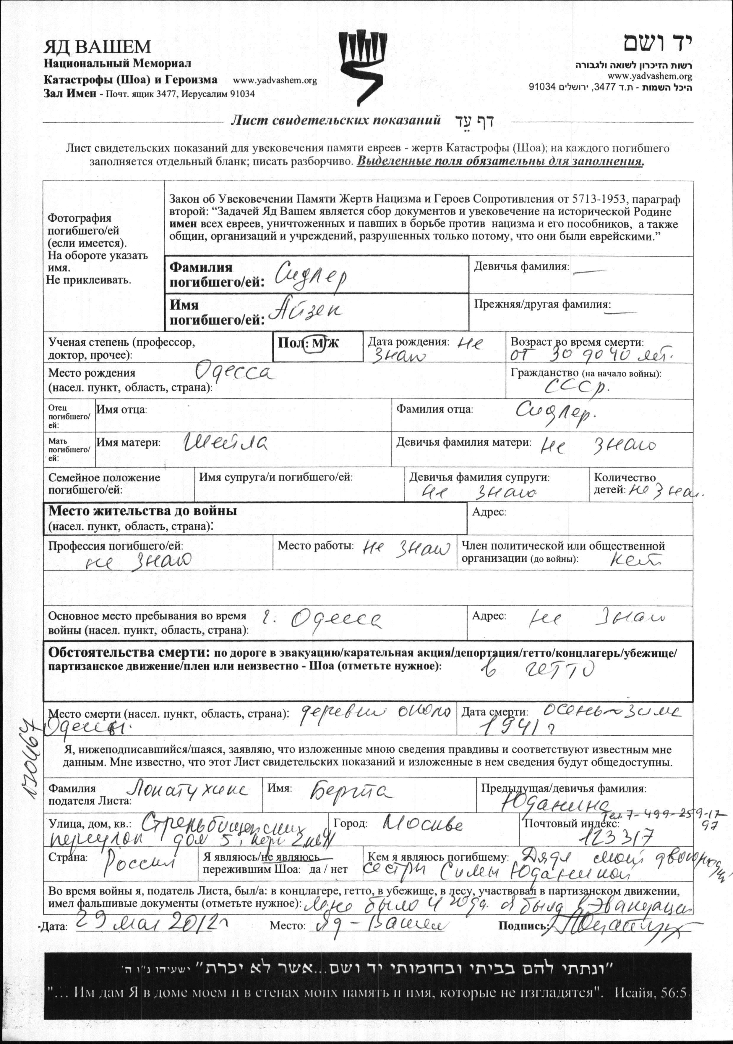 Сидлер Айзек место не указано, Лист свидетельских показаний