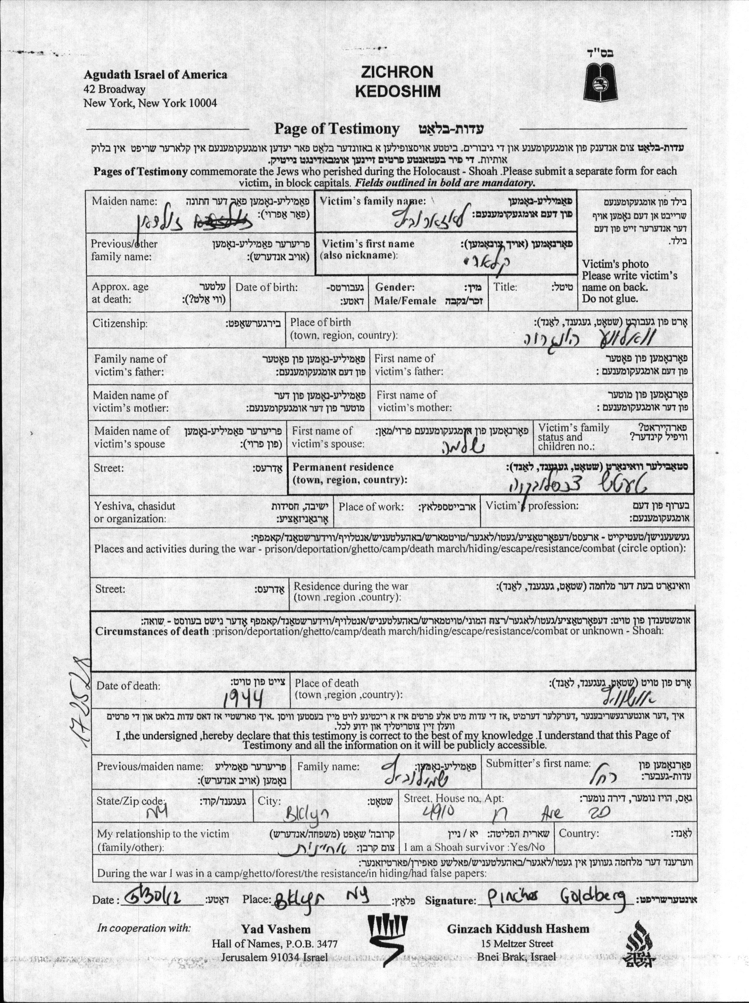 Клари уничтоженa в период Шоа. место смерти: Аушвиц, Польша в 1944.