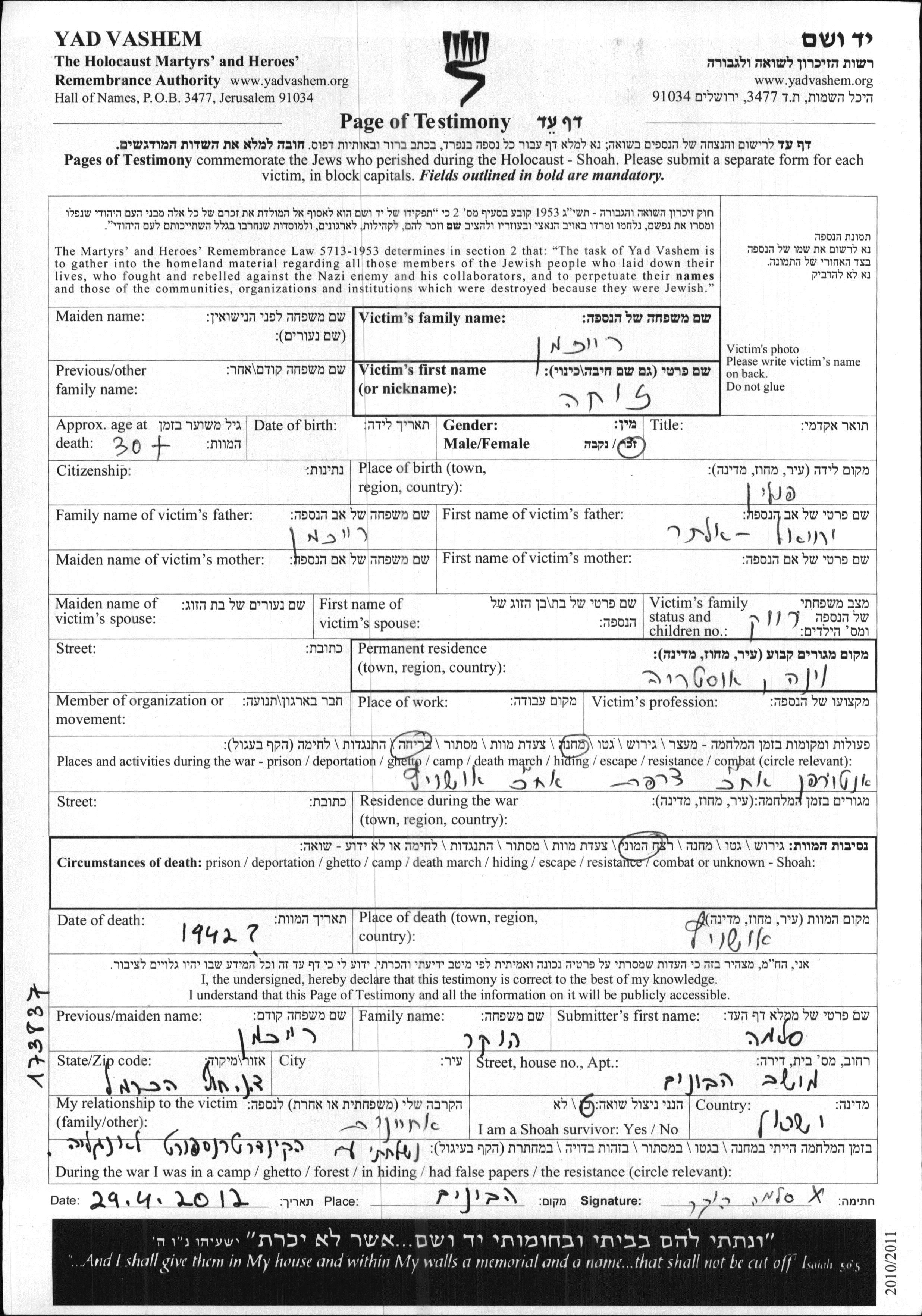Яд Вашем - Листы свидетельских показаний Мемориального фонда
