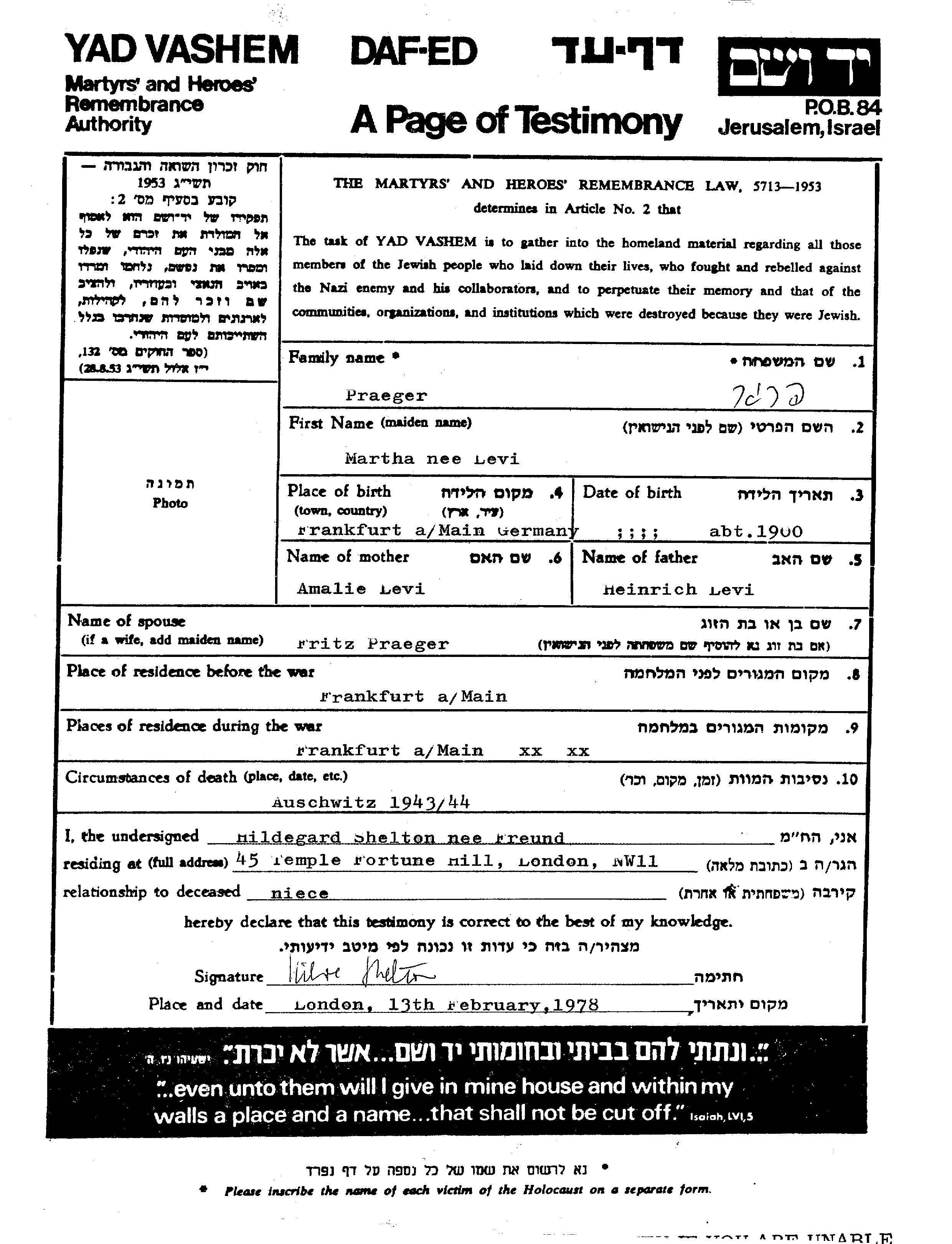 Марта Прегер, девичья фамилия Леви, место рождения: Франкфурт-на-Майне, Германия. Отец: Хайнрих, mать:Амали. Женат / замужем. Место жительства до войны: Франкфурт-на-Майне, Германия. Место во время войны: Франкфурт-на-Майне, Германия.
