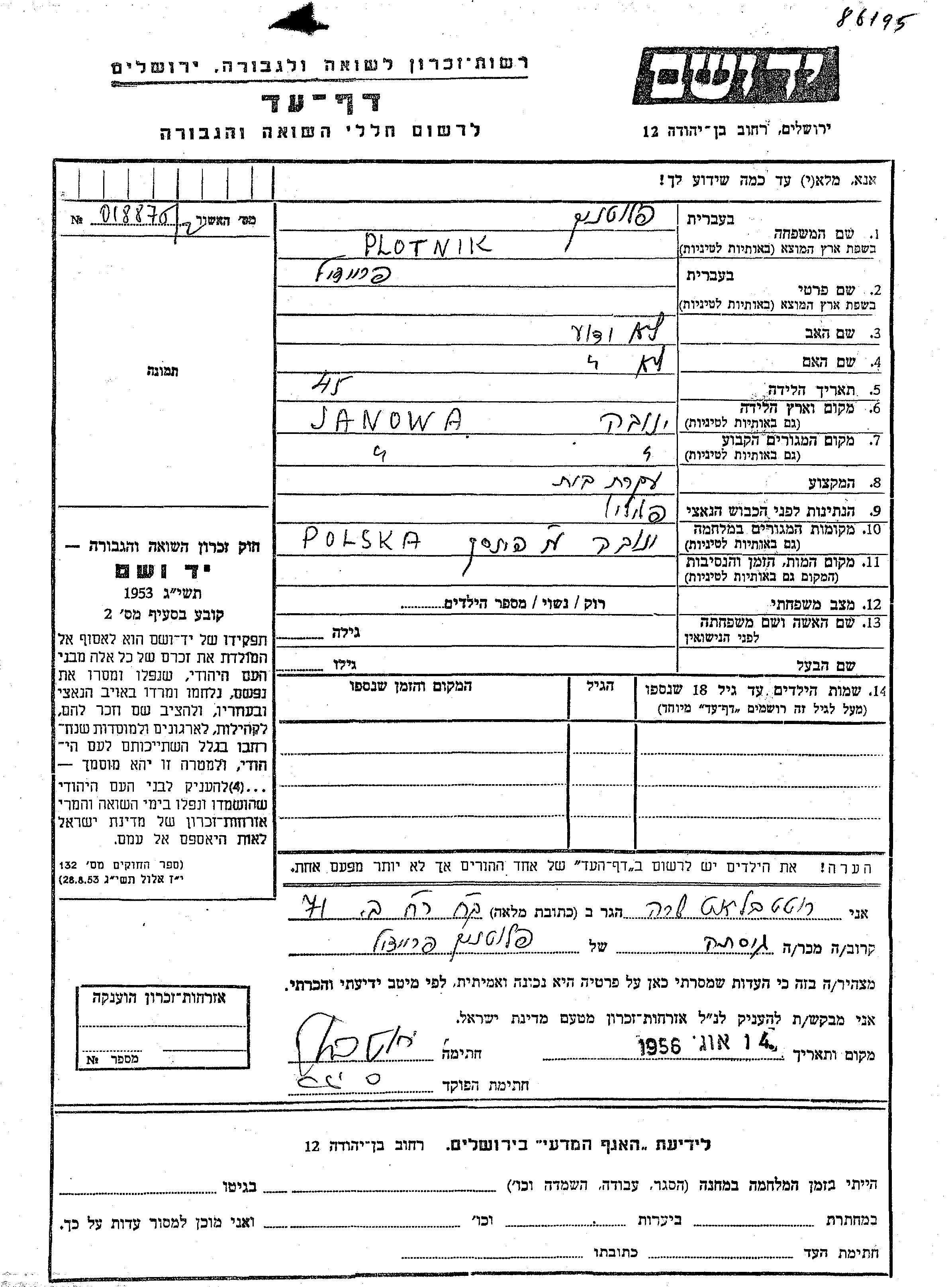 Фрейдел Плотник, место рождения: Йанова, Польша. Домохозяйка. Место жительства до войны: Йанова, Польша. Место во время войны: Йанова, Польша.