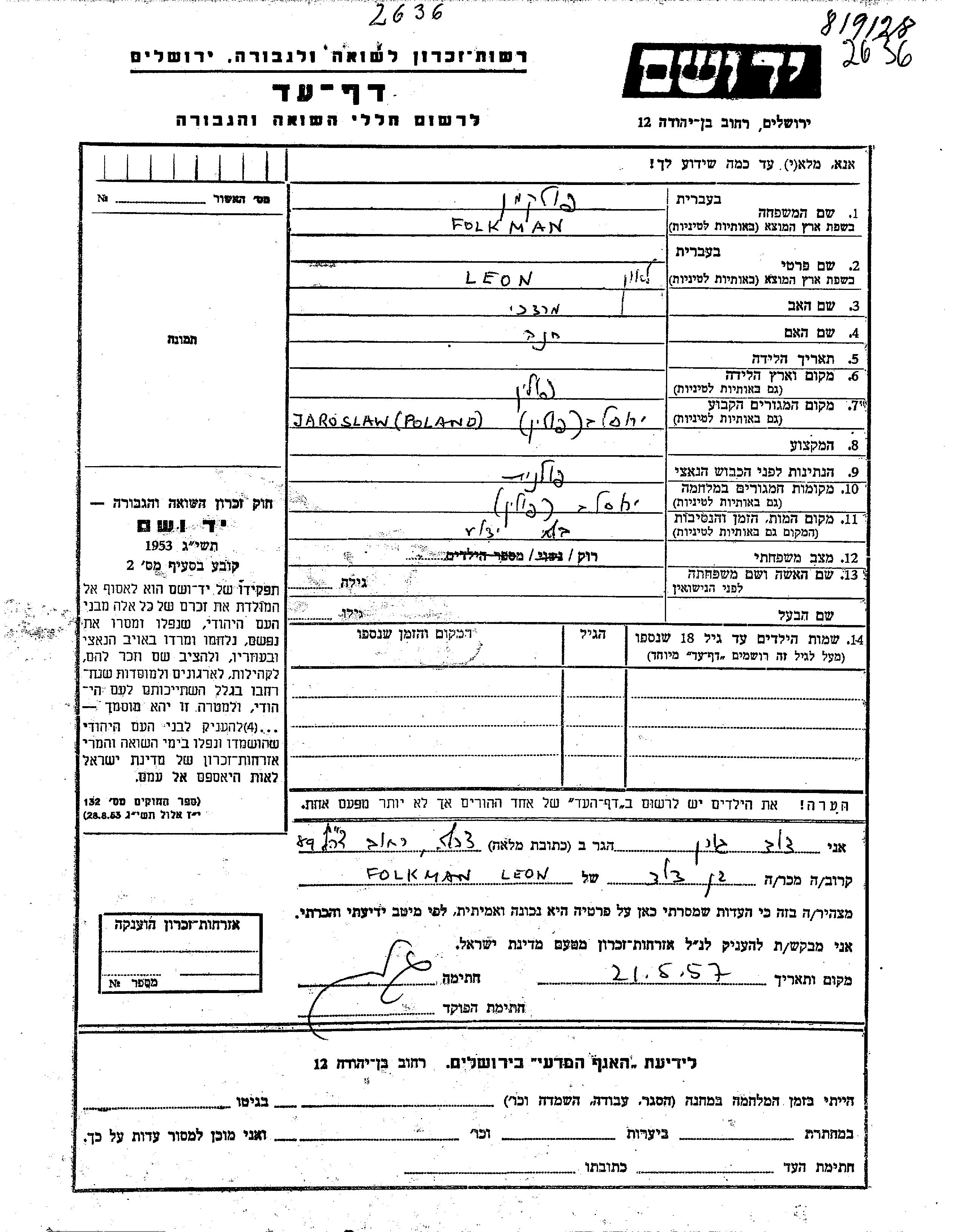Леон Фолькман, место рождения: Польша. Отец: Мордехай, mать:Хана. Холост / не замужем. Место жительства до войны: Ярослав, Польша. Место во время войны: Ярослав, Польша.