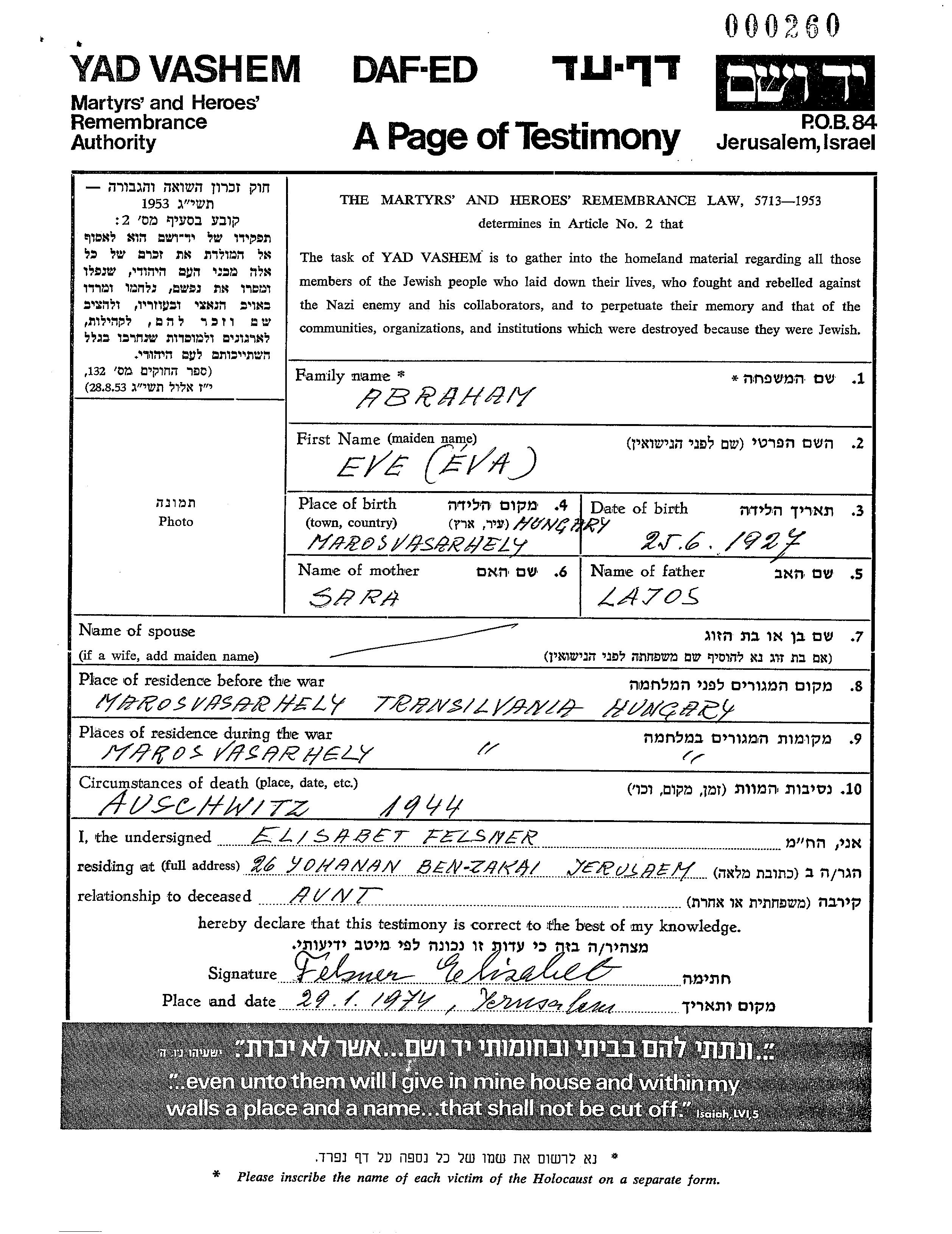 Эве Абрахам, место рождения: Марошвашархей, Румыния. Отец: Лайош, mать:Сара. Место жительства до войны: Марошвашархей, Румыния. Место во время войны: Марошвашархей, Румыния.