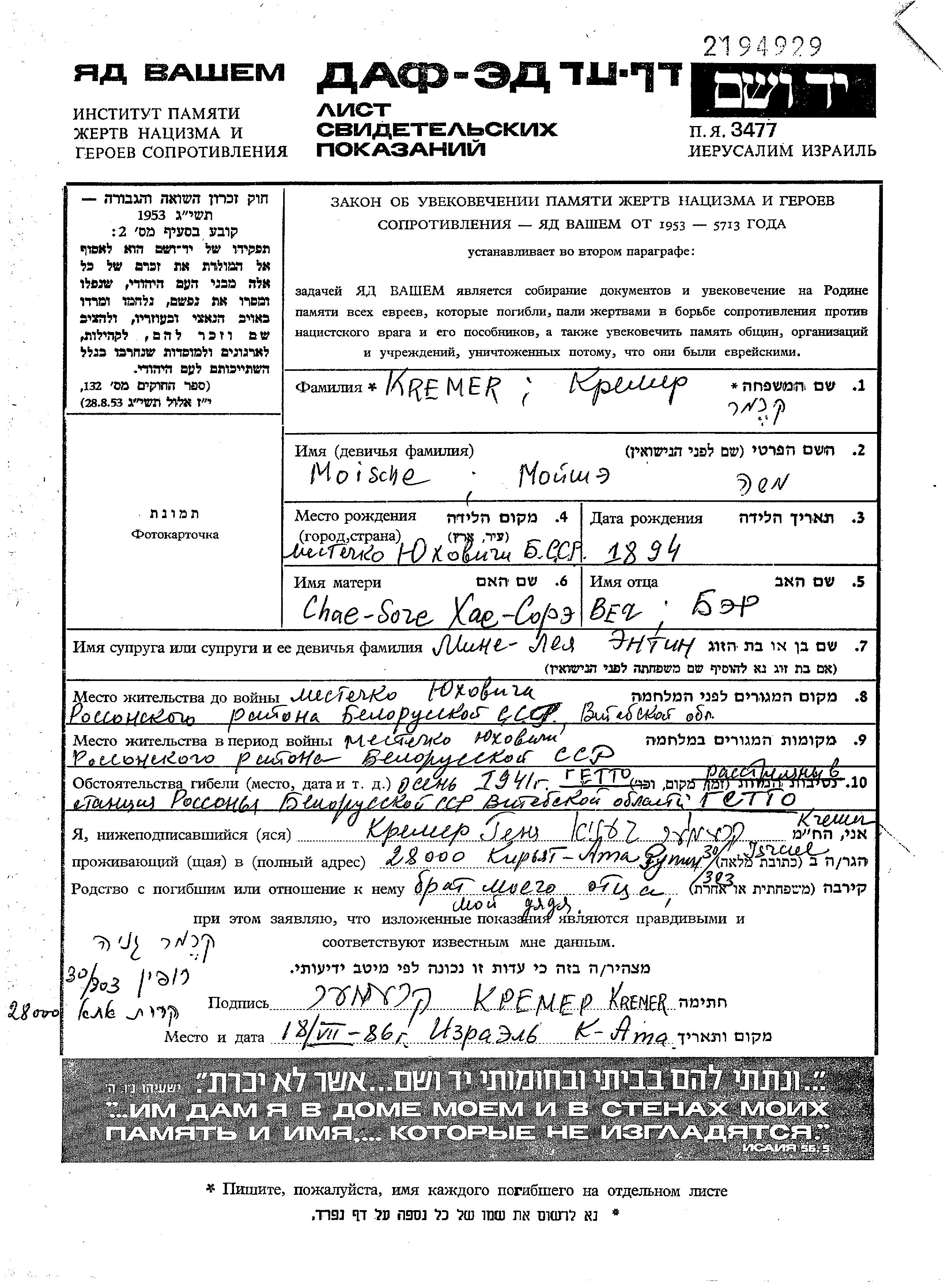 Кремер Мойше 1894 Юховичи, Белоруссия (СССР) Лист свидетельских показаний