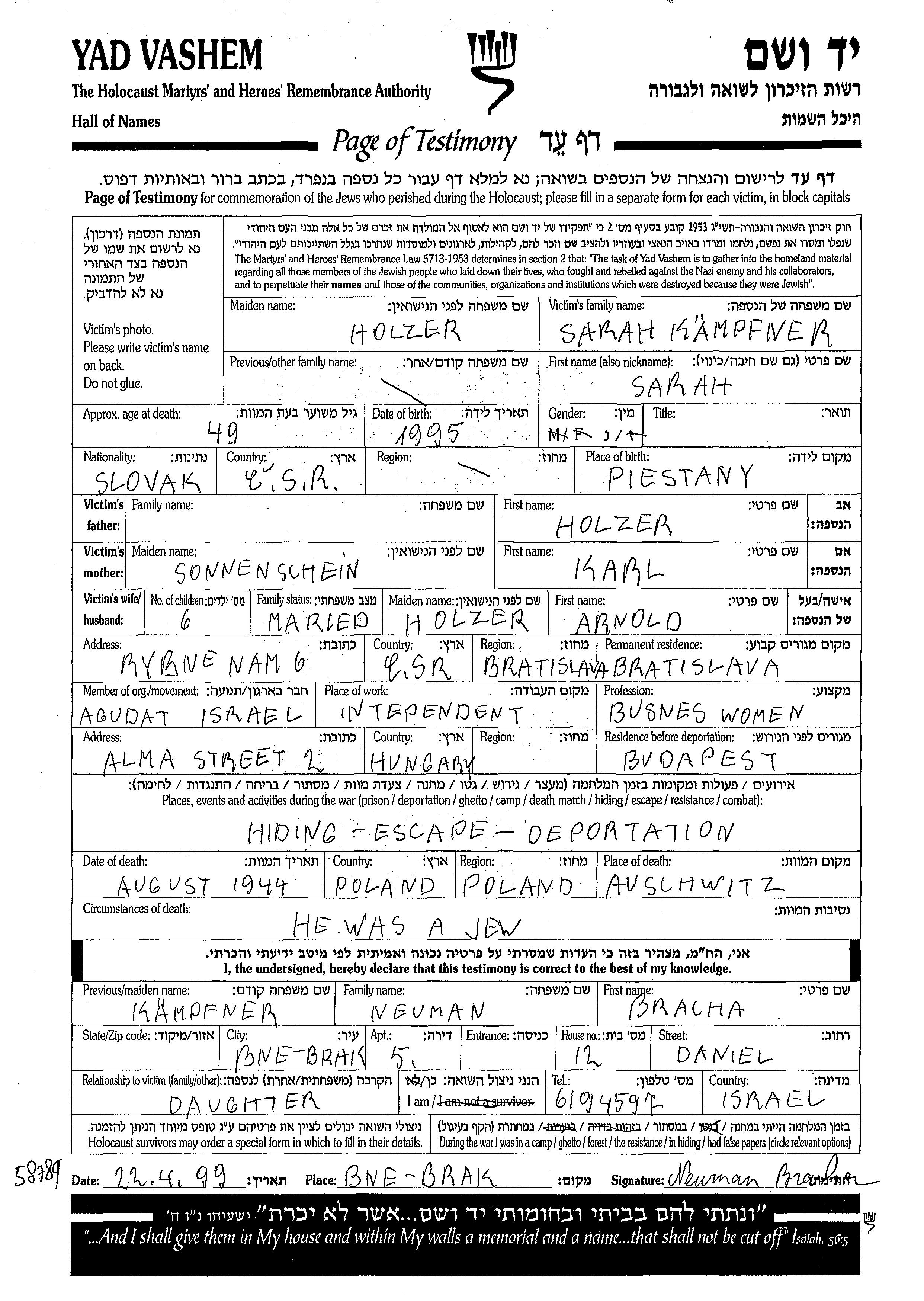 Сара Кемпфнер, девичья фамилия Хольцер, место рождения: Пьештяны, Чехословакия.Mать:Карл, девичья фамилия Хольцер. Предпринимательница. Женат / замужем. Место жительства до войны: Братислава, Чехословакия. Место во время войны: Будапешт, Венгрия.