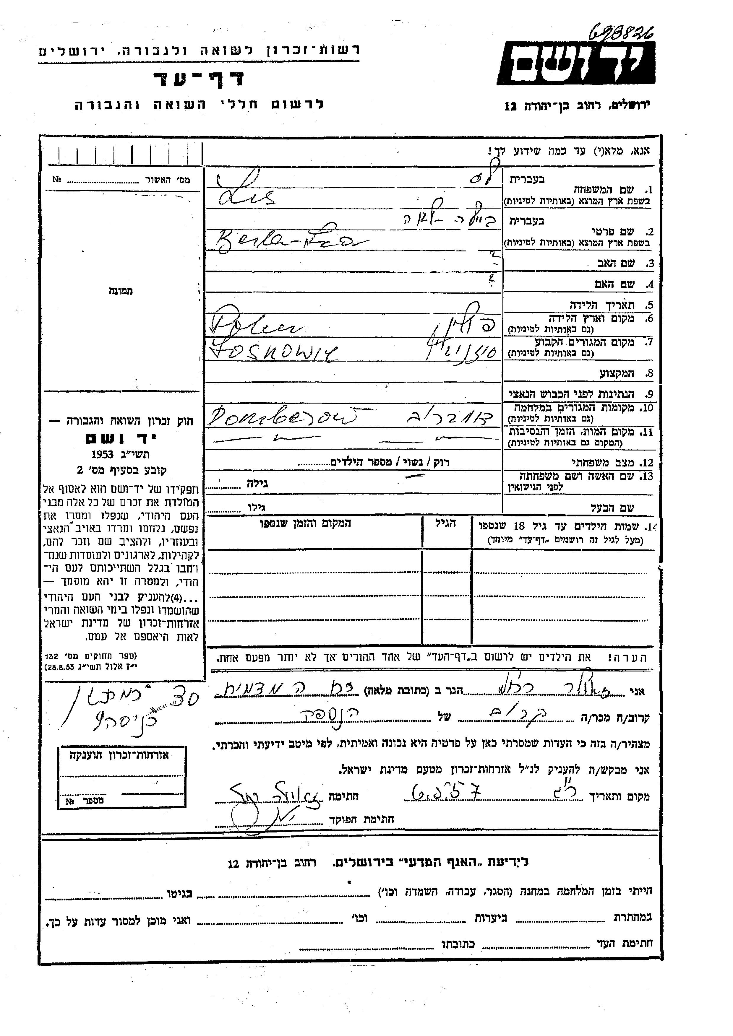 Бейла Лея Лис, место рождения: Польша. Женат / замужем. Место жительства до войны: Сосновце, Польша. Место во время войны: Dąbrowa, Польша.