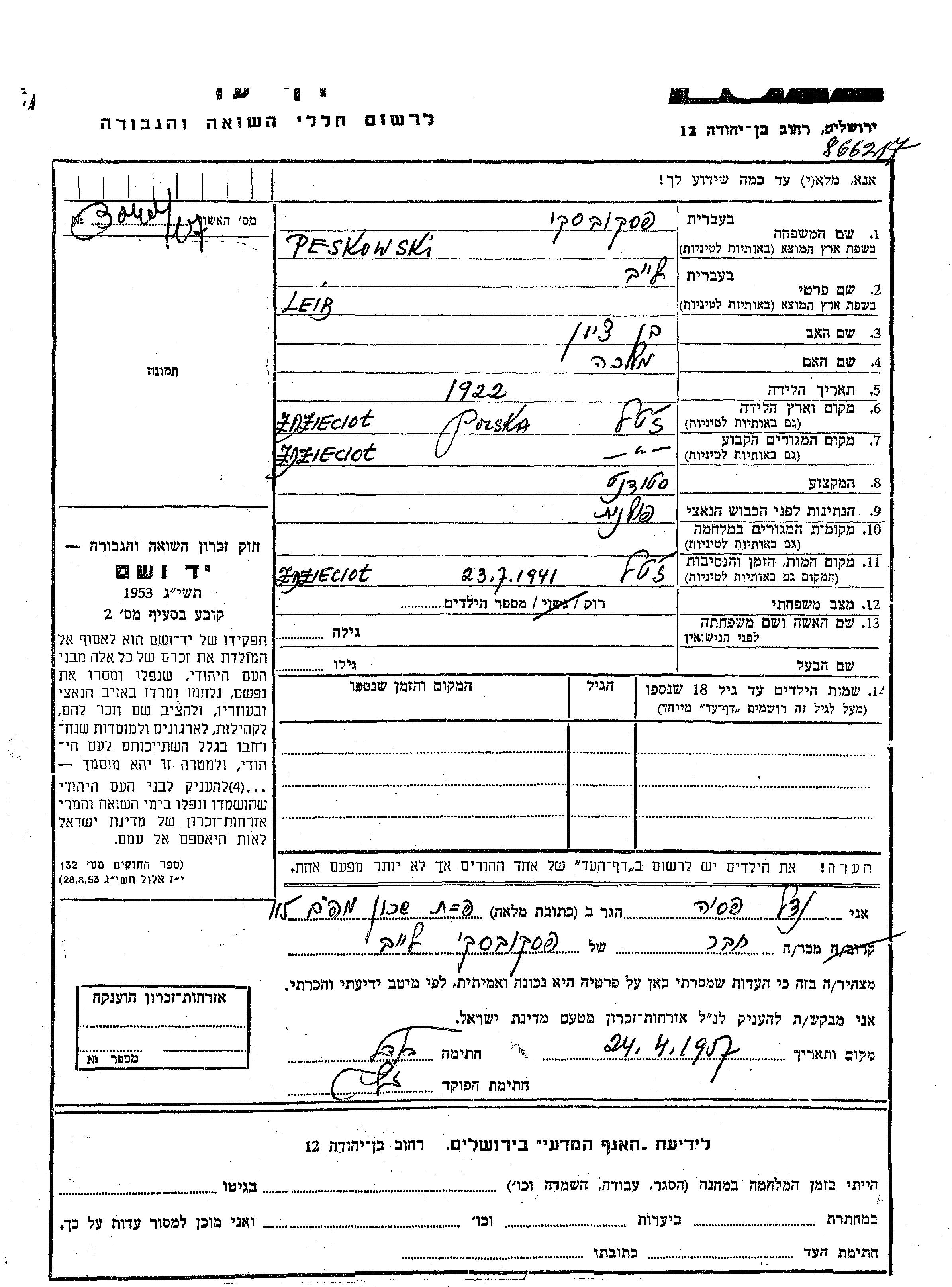 Лейб Песковски, место рождения: Здзенцёл, Польша. Отец: Бенцион, mать:Малка. Студент / студентка. Холост / не замужем. Место жительства до войны: Здзенцёл, Польша.