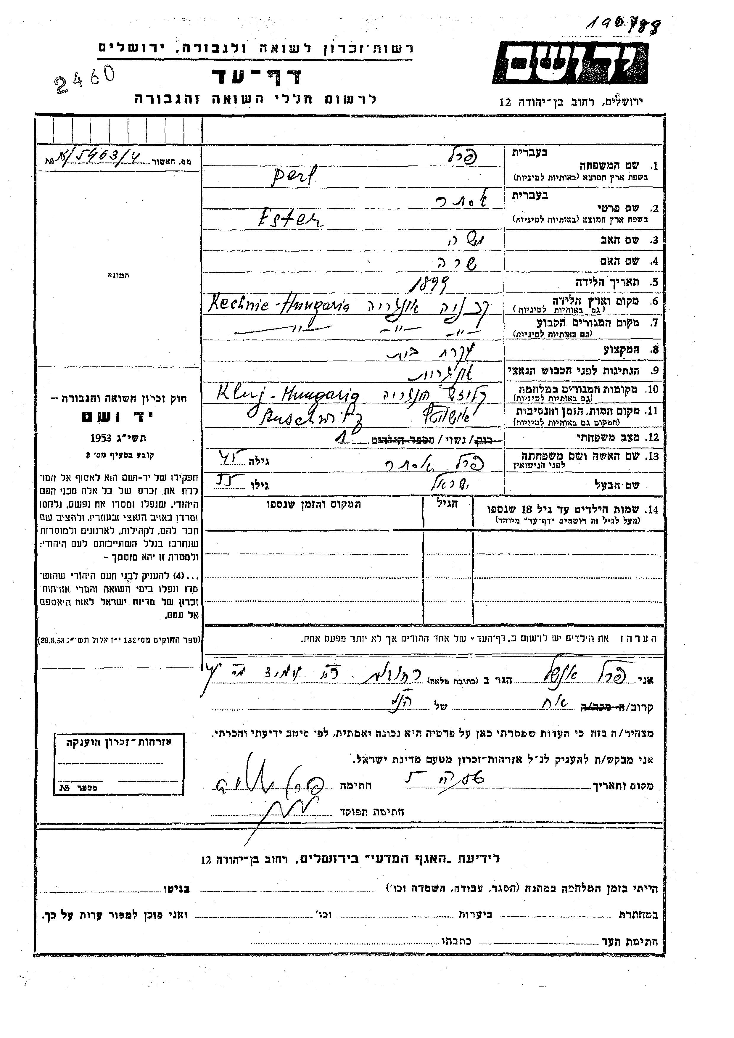 Эстер Перль, место рождения: Кехние, Румыния. Отец: Моше, mать:Сара. Домохозяйка. Женат / замужем. Место жительства до войны: Кехние, Румыния. Место во время войны: Клуж, Румыния.