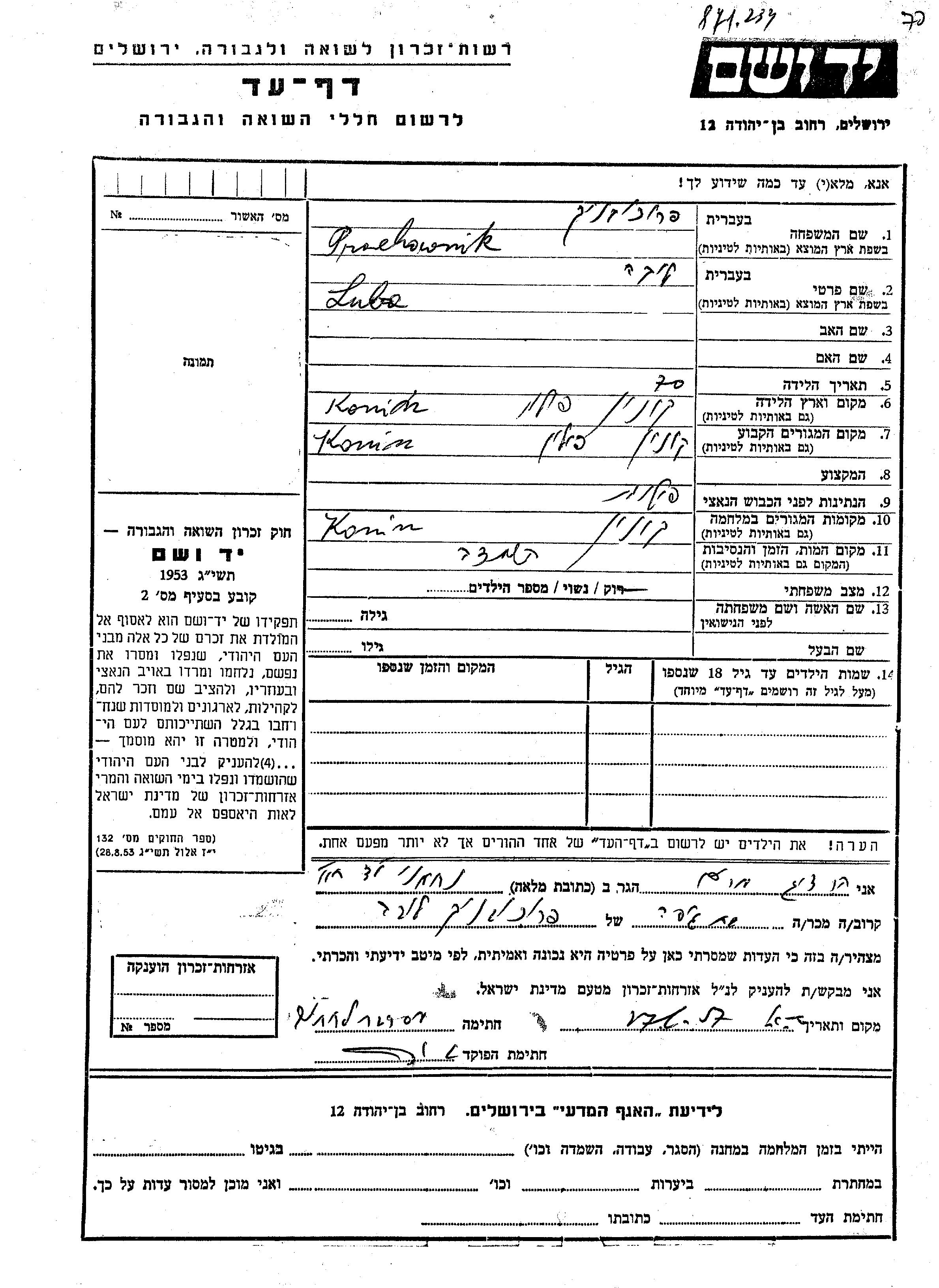Люба Проховник, место рождения: Конин, Польша. Женат / замужем. Место жительства до войны: Конин, Польша. Место во время войны: Конин, Польша.