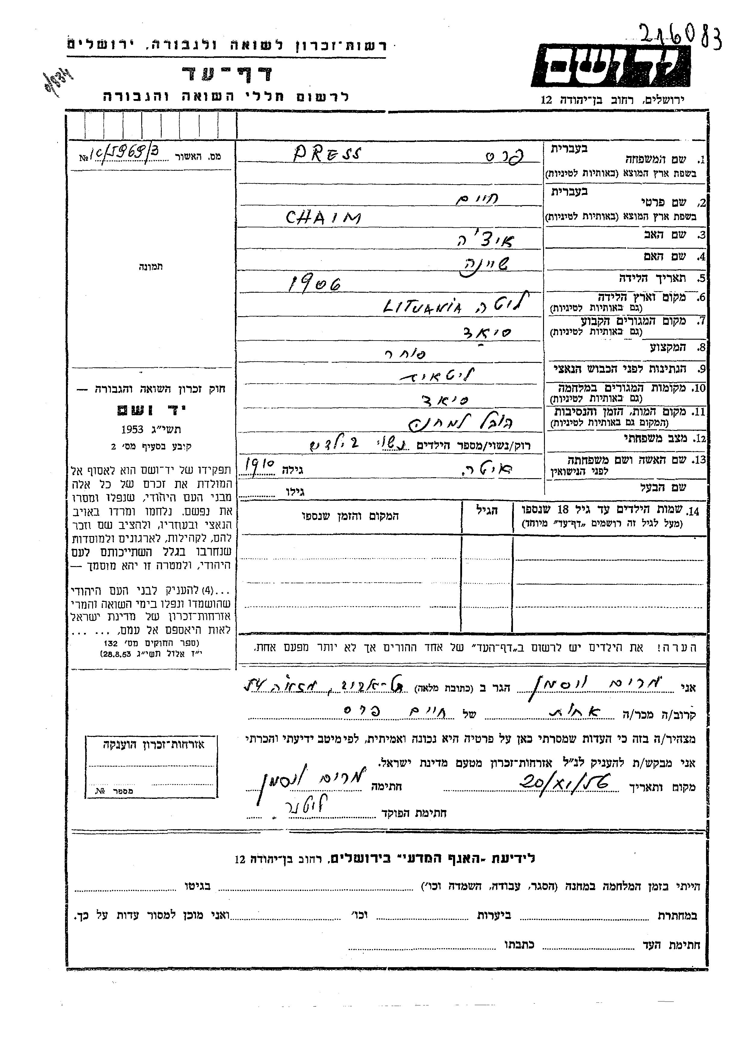 Хаим Пресс, место рождения: Литва. Отец: Иче, mать:Шейна. Торговец / торговка. Женат / замужем. Место жительства до войны: Шьяд. Место во время войны: Шьяд.