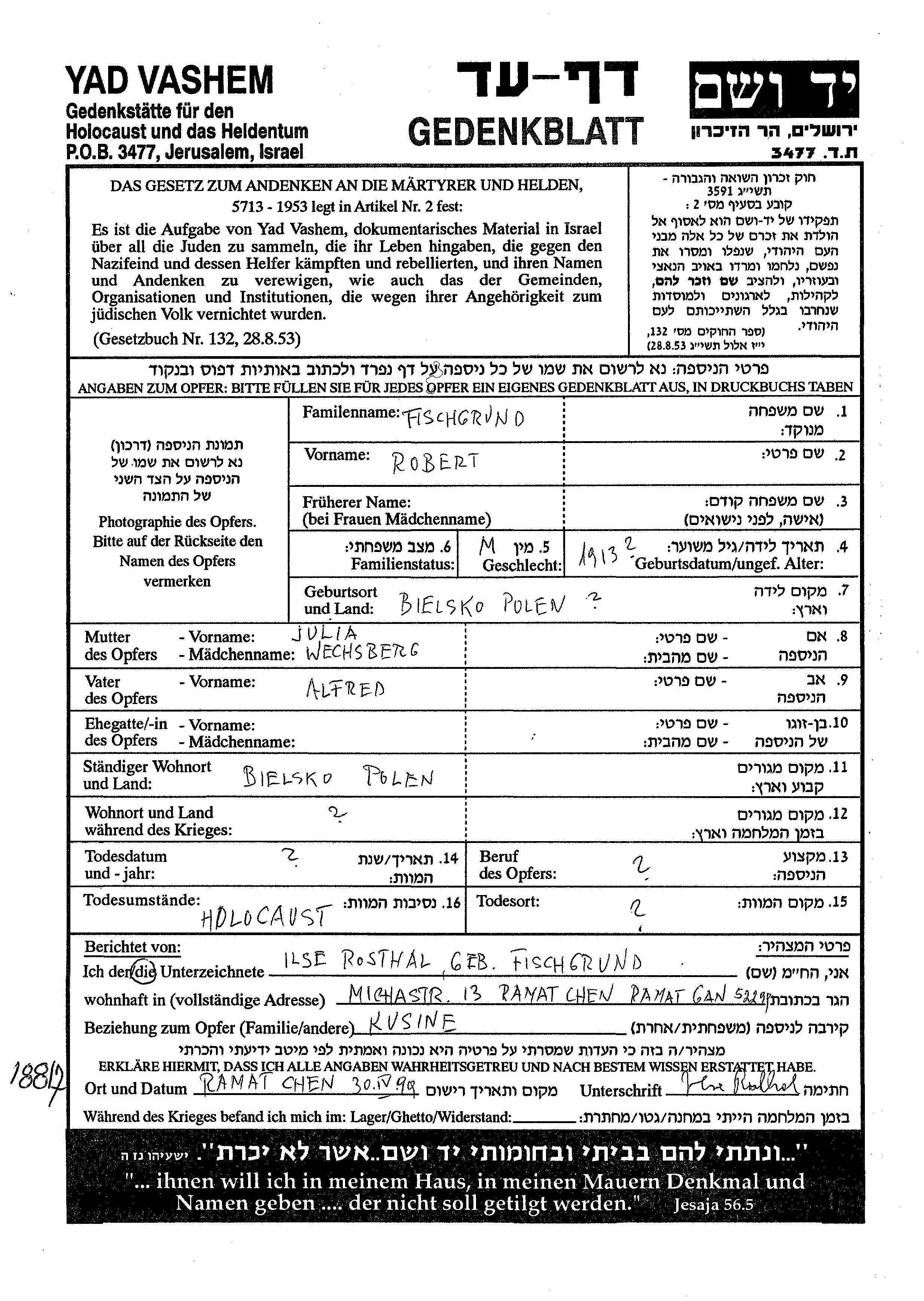 Роберт Фишгрунд, место рождения: Бельско, Польша. Отец: Альфред, mать:Юлия. Место жительства до войны: Бельско, Польша.