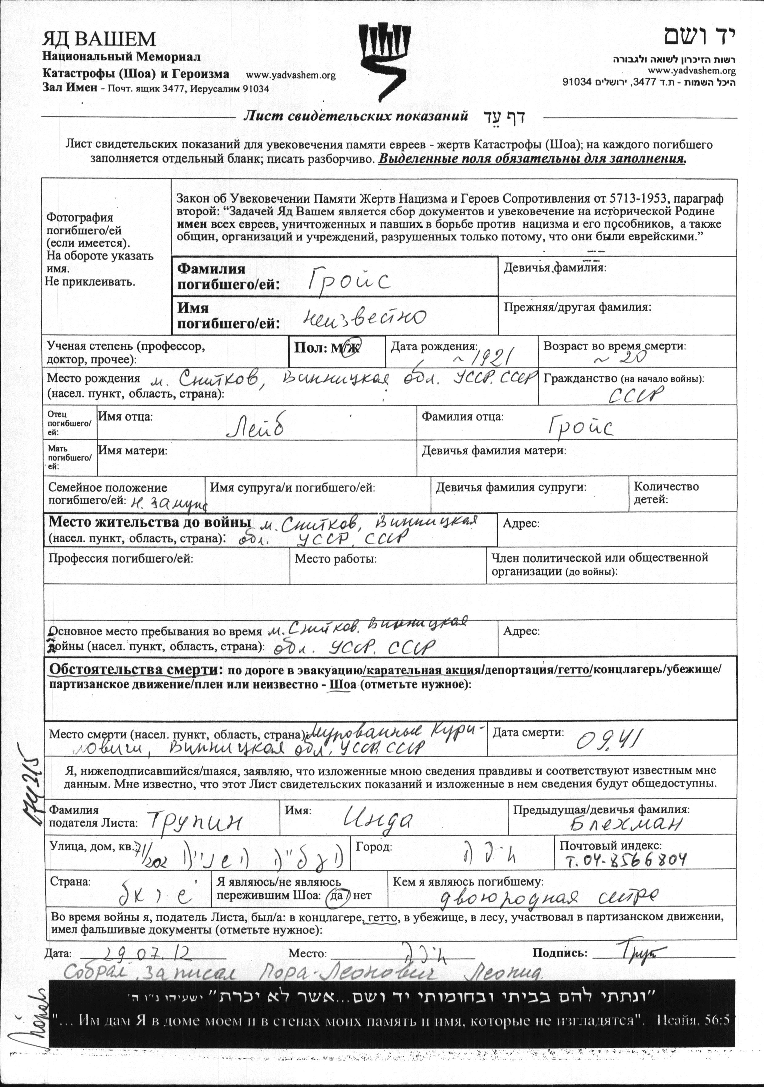 Яд Вашем - Листы свидетельских показаний Мемориального фонда