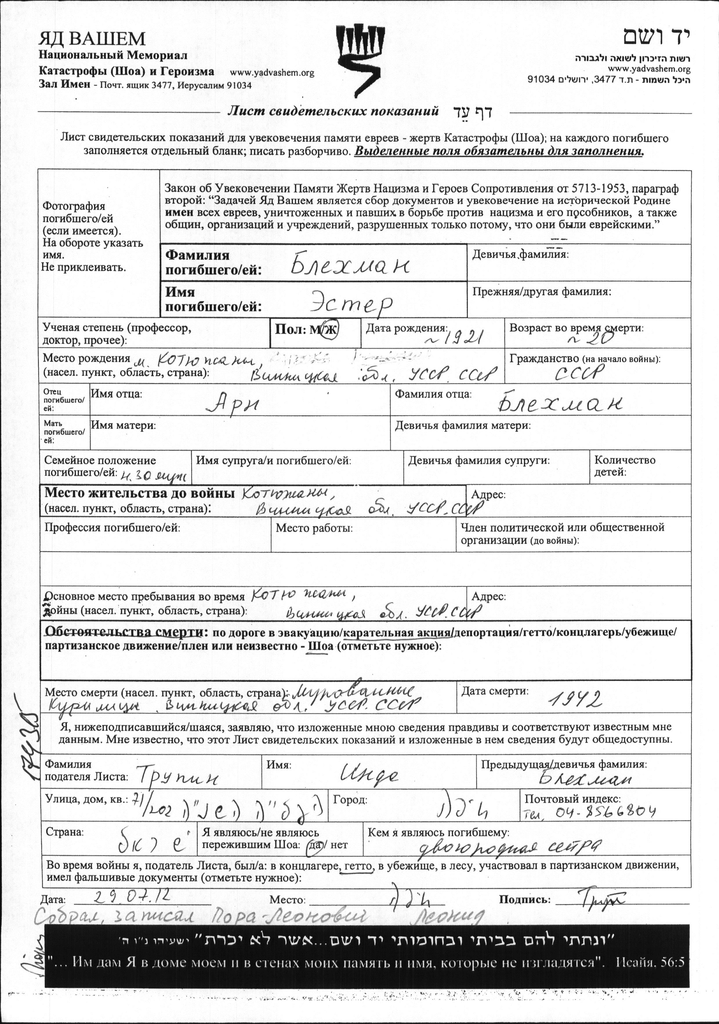Блехман Эстер 1921 Котюжаны, Украина (СССР) Лист свидетельских показаний