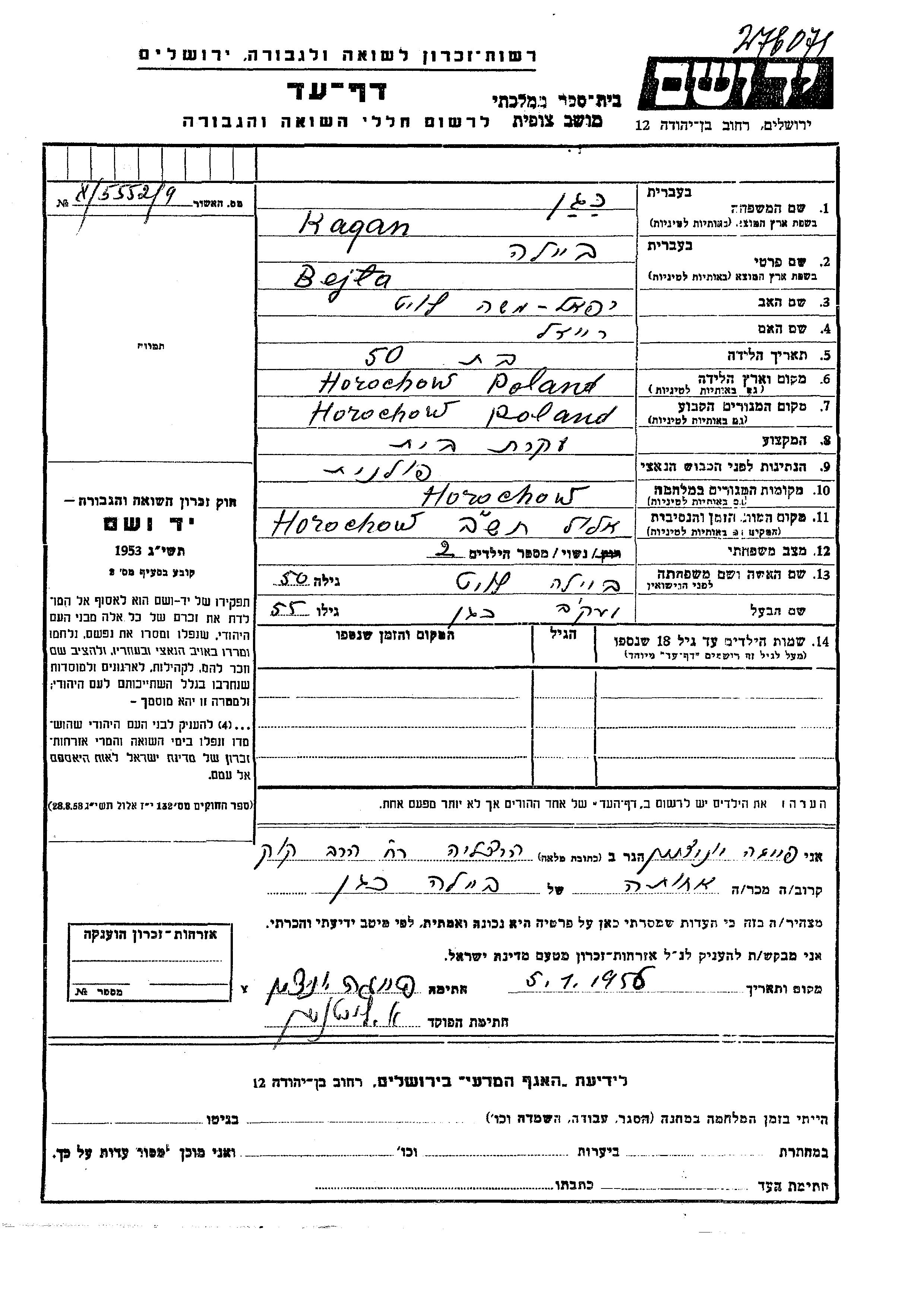 Бейла Каган, девичья фамилия Левит, место рождения: Горохов, Польша. Отец: Рафаэль Моше, mать:Рейзл. Домохозяйка. Женат / замужем. Место жительства до войны: Горохов, Польша. Место во время войны: Горохов, Польша.