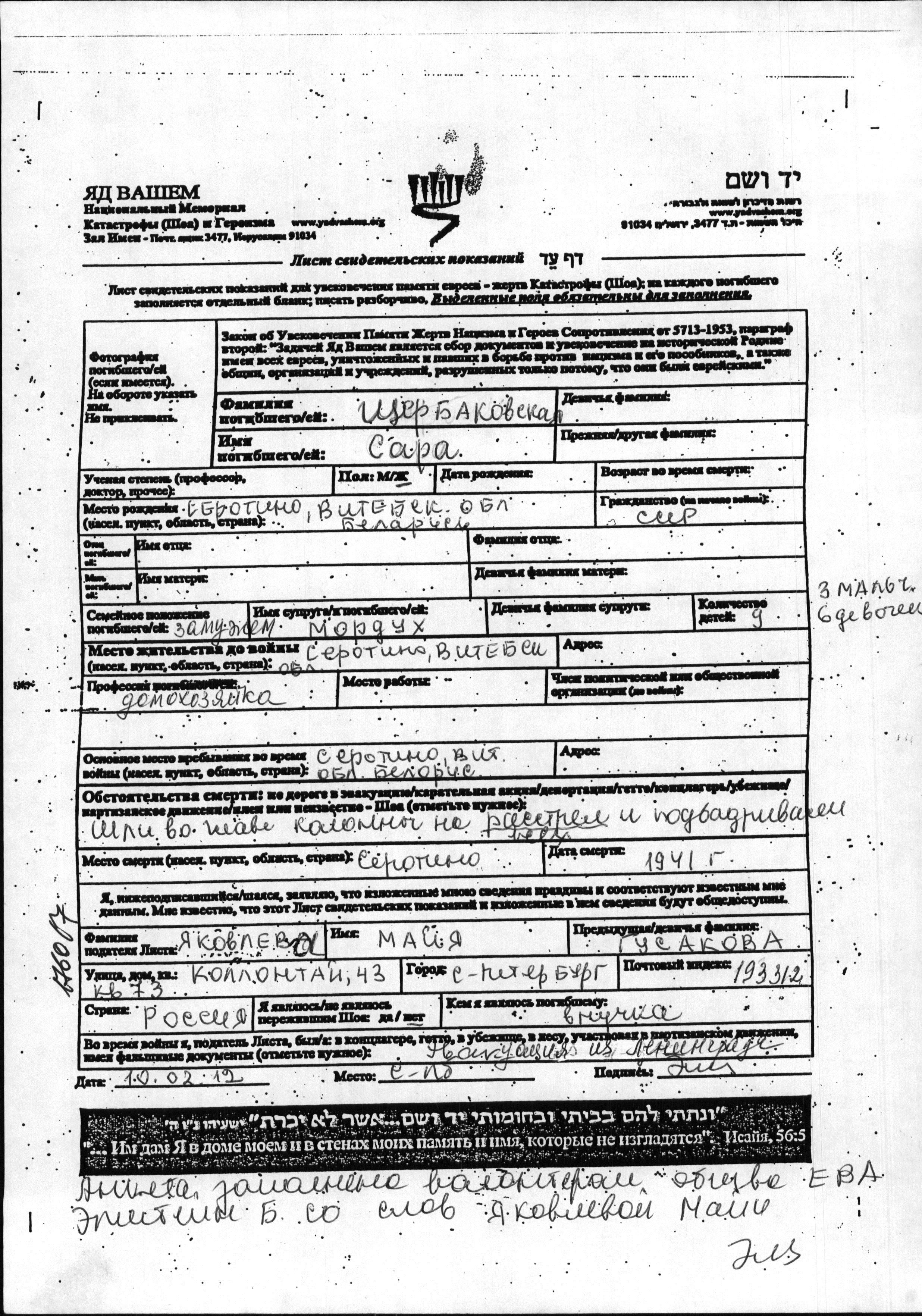 Щербаковская Сара Сиротино, Белоруссия (СССР) Лист свидетельских показаний